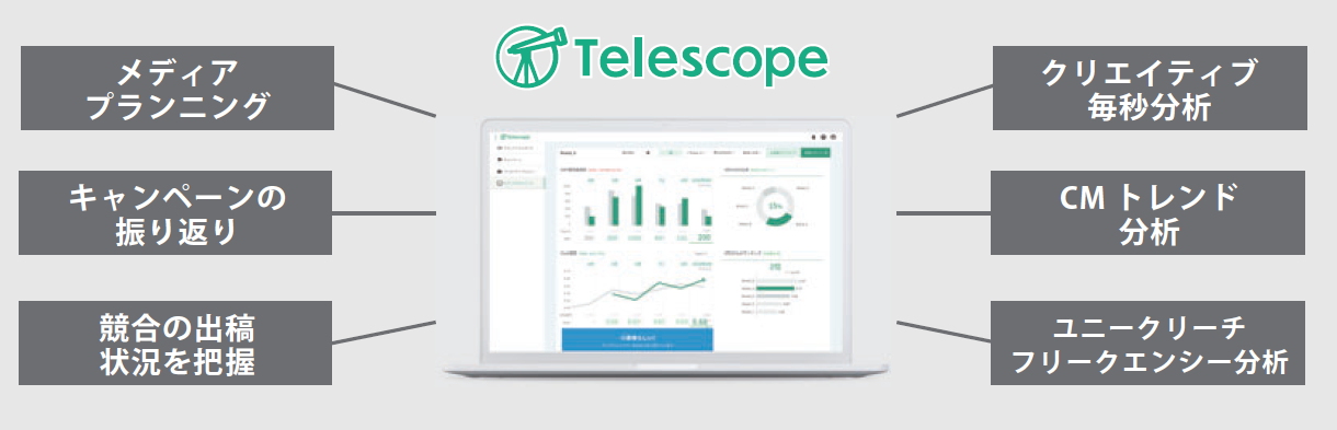 Telescopeは、テレビCMのメディアもクリエイティブも、Web画面上で改善ポイントが一目でわかり、PDCAを回しながら、視聴者の注視を最大限に高められるツールです。その他に、主に下記のような機能があります(Telescope紹介ページ>https://telescope-lp.revisio.com/