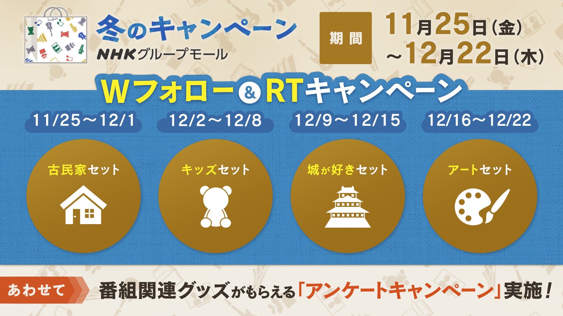 NHK関連グループ各社の各ECサイトやコンテンツと連携し、ダブルフォロー&RTキャンペーンを実施します。あわせて「アンケートキャンペーン」も実施します。