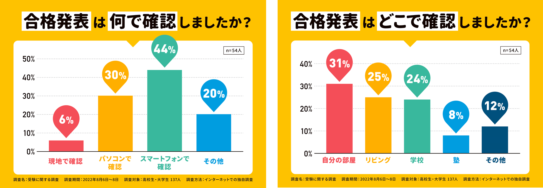 高校生・大学生の約7割が、受験の合格発表をスマートフォン(44%)やPC(30%)で確認したと回答。