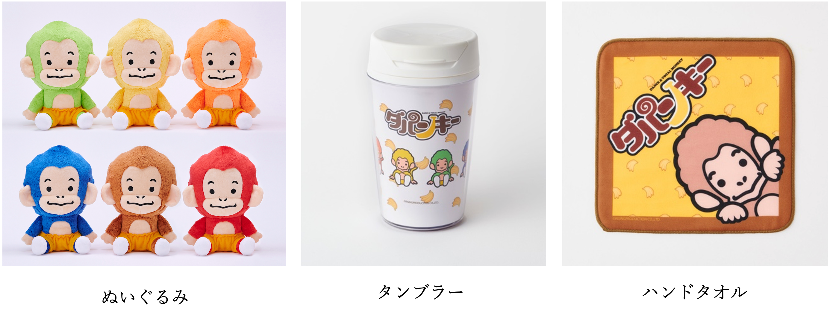 これまでも公式オンラインストア ダパンキーショップで好評頂いている、ぬいぐるみやタンブラー、ハンドタオルなどの既存商品も販売いたします!