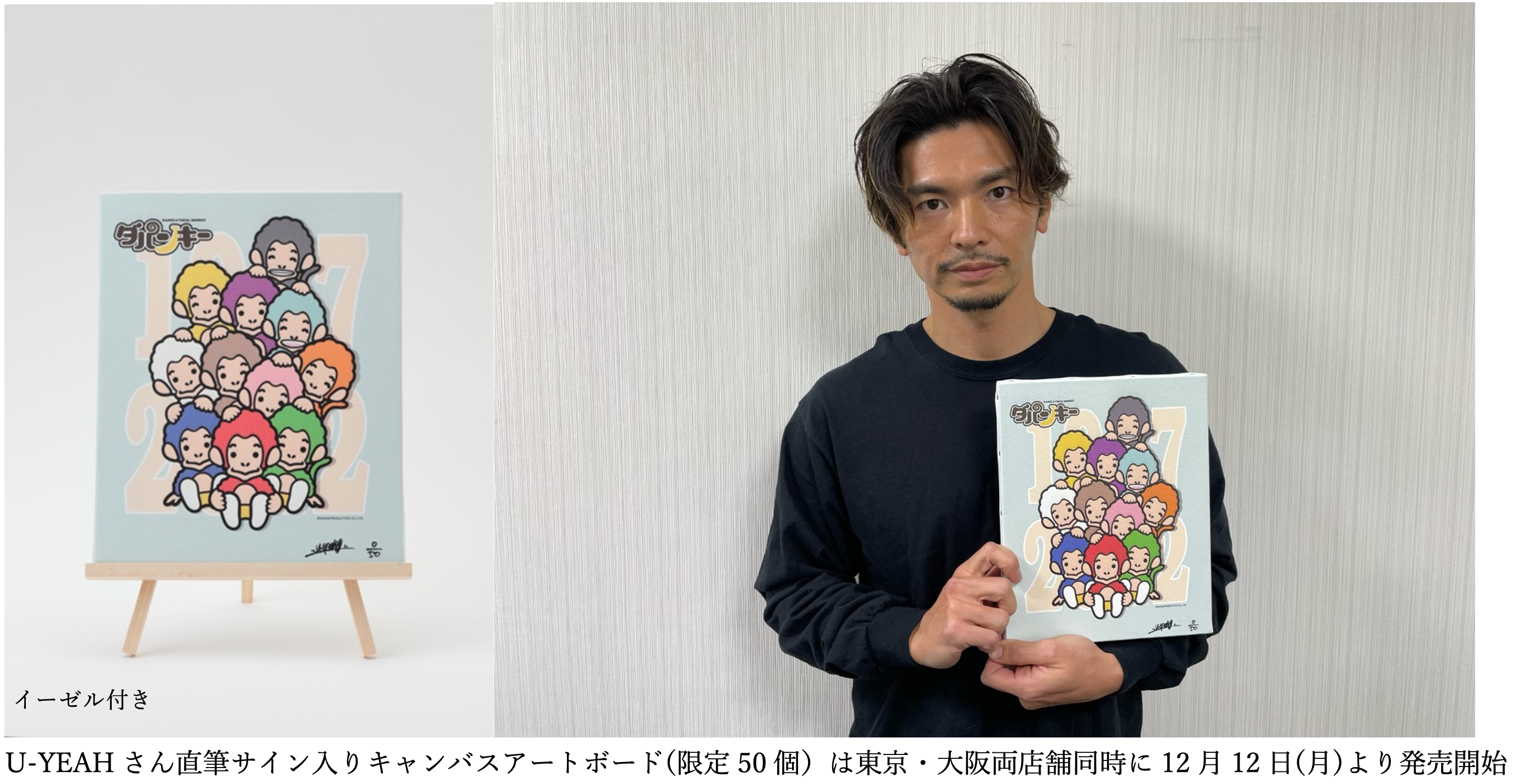 サクラクレパスとのコラボによる特製クーピーペンシルやステッカー、アクリルスタンドなど新商品を多数ラインアップ。さらに、DA PUMKEYの産みの親である、DA PUMPメンバーのU-YEAHさん直筆サイン入りキャンバスアートボードが限定50個で販売されます!アートボードは、東京・大阪両店舗同時に12月12日(月)より販売スタート!ぜひ会場に足をお運びください。