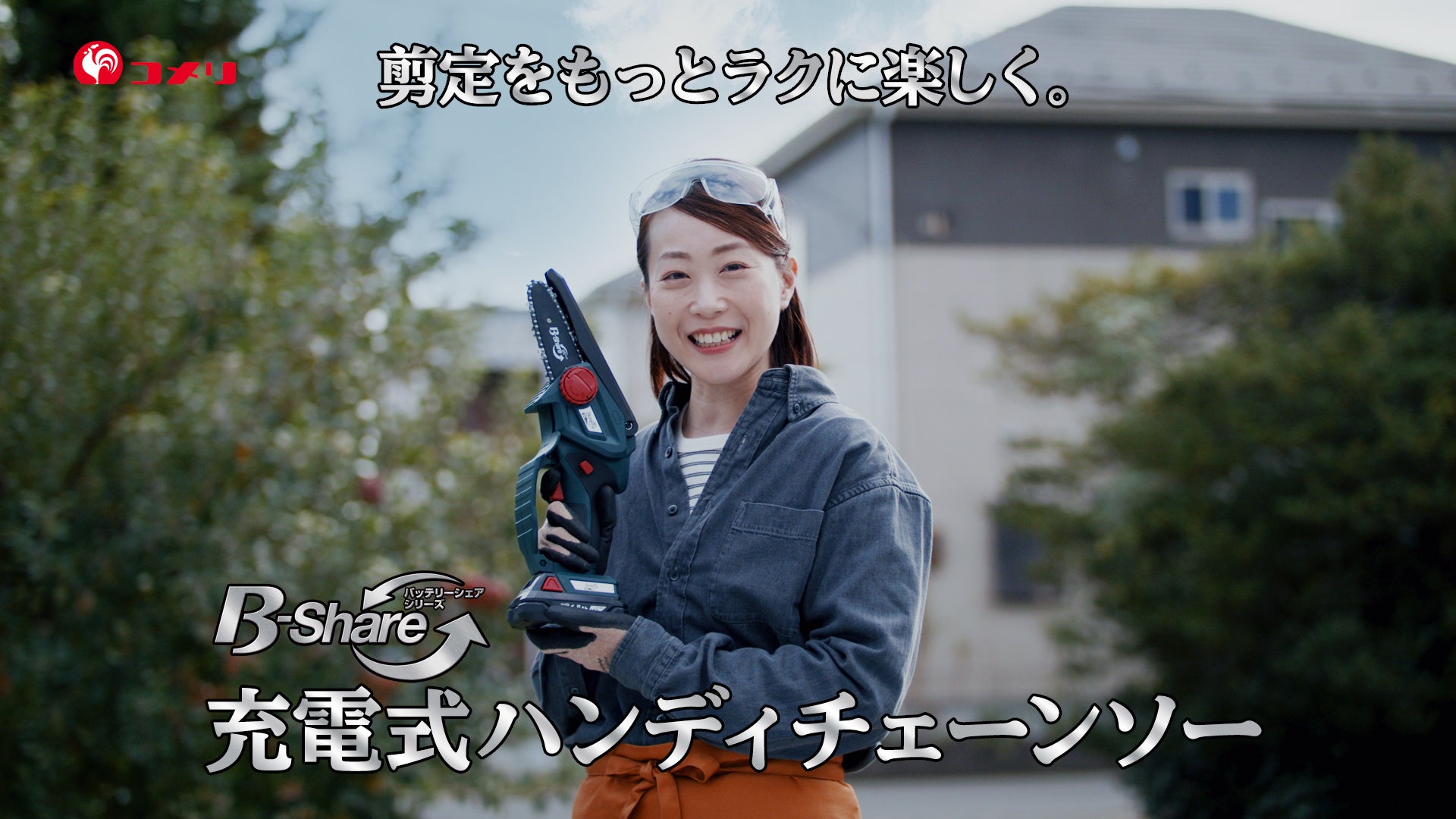 庭木のお手入れはお家周りのキレイな景観を保つためには必須の作業です。しかし、自力での剪定や剪定後の切り落とした枝葉の処理はなかなの重労働です。そんな庭木のお手入れや木材の切断にも使える、手軽でパワフルな『B-Share 充電式ハンディチェーンソー』のCMが11月26日(土)より全国で放映を開始いたします。