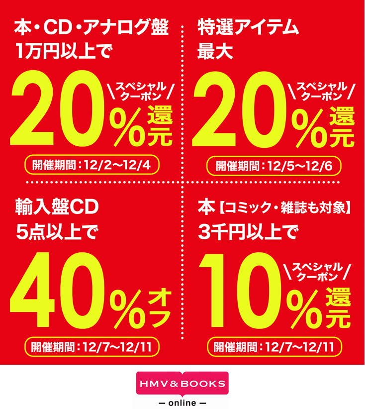 HMV&BOOKS onlineでは、本・CD・アナログ盤の対象商品を1万円(税込)以上まとめてお買い上げいただくと、購入金額20%分をスペシャルクーポンで還元いたします。