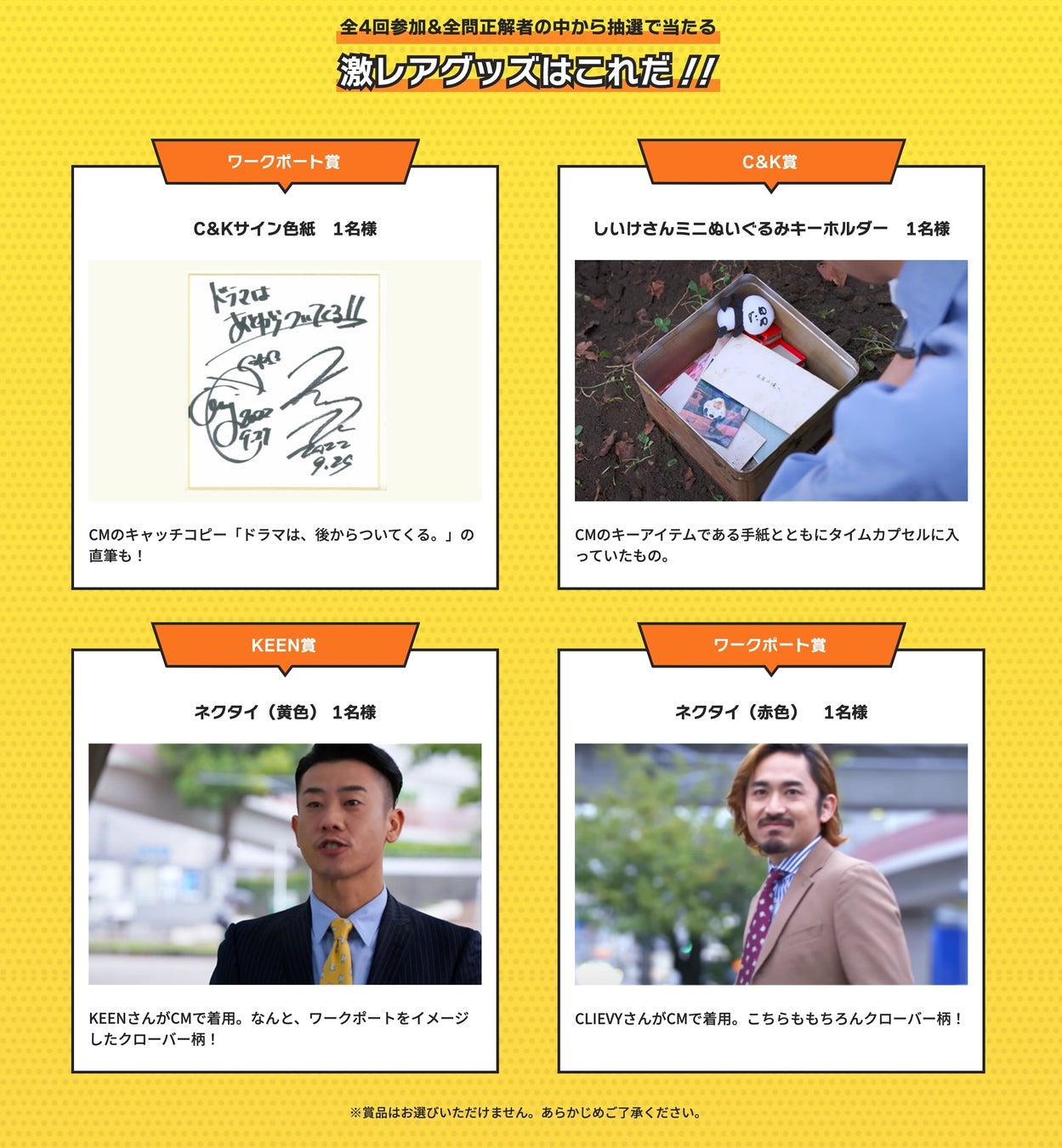 CMやMaking Movieを視聴して、全4回出題されるクイズに参加し、4回すべてのクイズに全問正解した方の中から抽選でCMで使用した貴重なグッズやサイン色紙をプレゼントします。