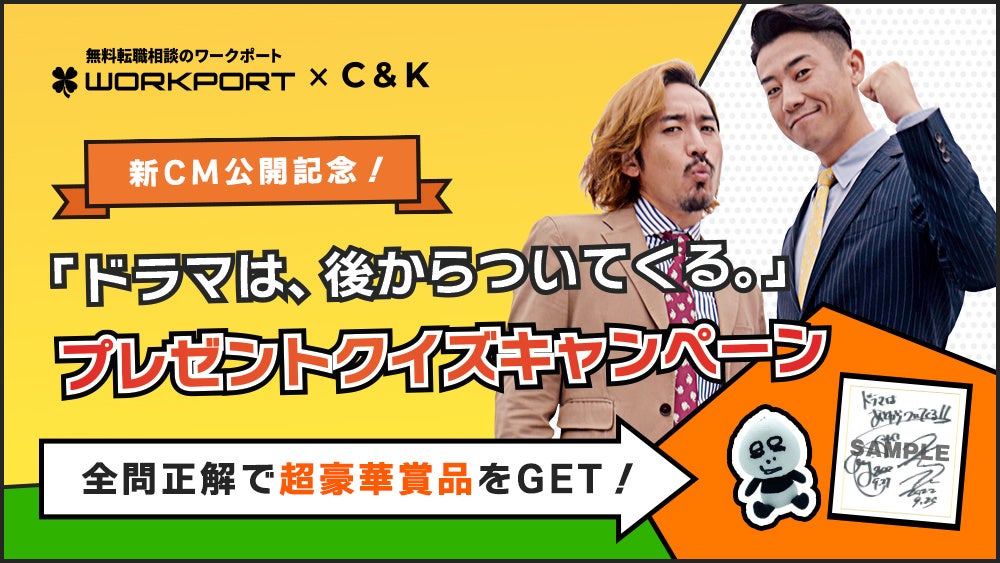 総合転職エージェントの株式会社ワークポート(本社所在地:東京都品川区、代表取締役社長 CEO:田村高広)は、11月16日に公開したC&K(CLIEVYとKEENからなる男性二人組シンガーソングライターユニット)とのコラボCM『ドラマは、後からついてくる。』の公開を記念して、11月25日より『全問正解で超豪華賞品が当たる!「ドラマは、後からついてくる。」プレゼントクイズキャンペーン』(全4回)を開催することをお知らせします。