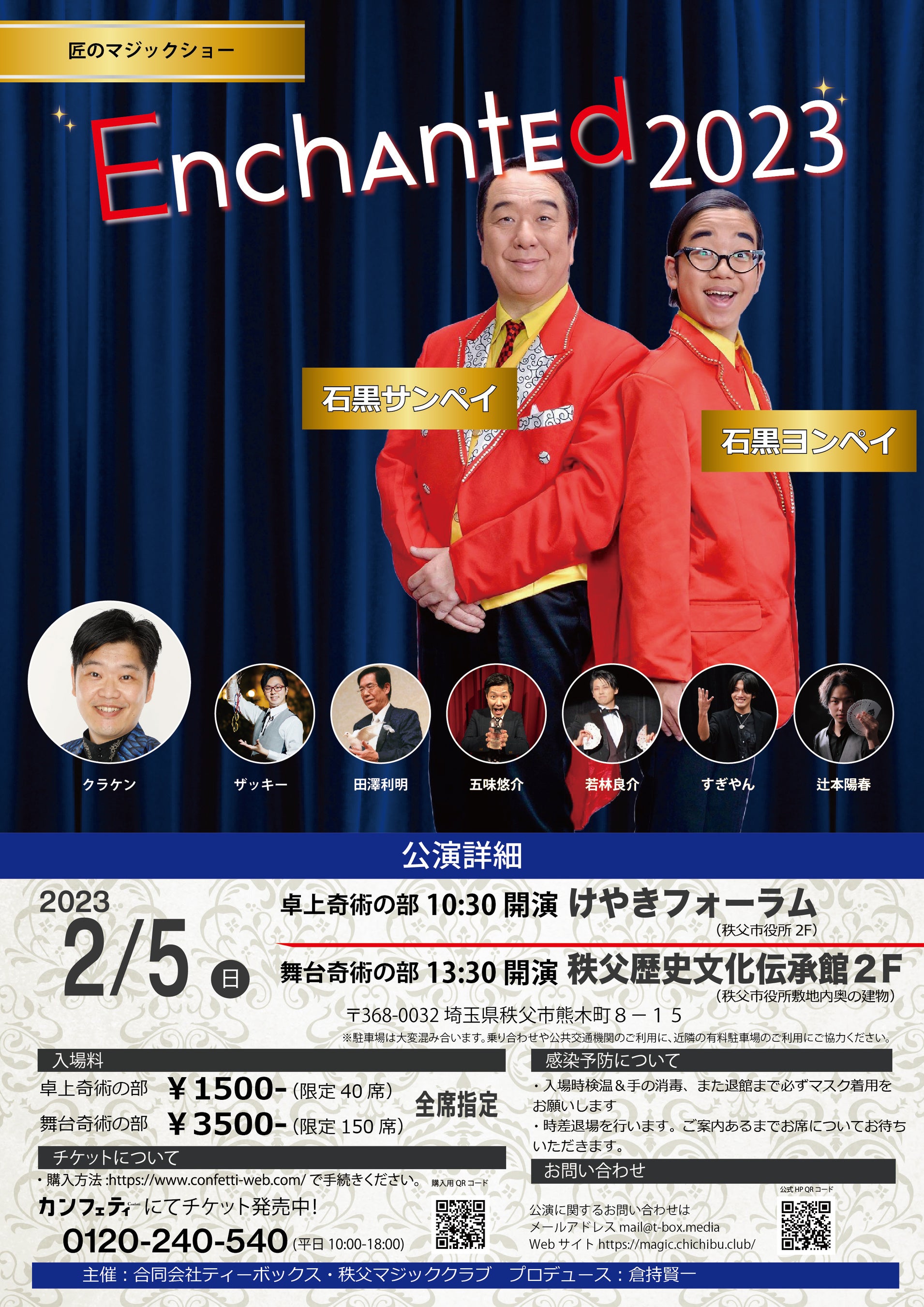 合同会社ティーボックス(埼玉県秩父市、代表:倉持 賢一)主催、『匠のマジックショー[Enchanted]』が2023年2月5日 (日)に秩父市役所2F けやきフォーラム(埼玉県秩父市熊木町8-15)にて開催されます。