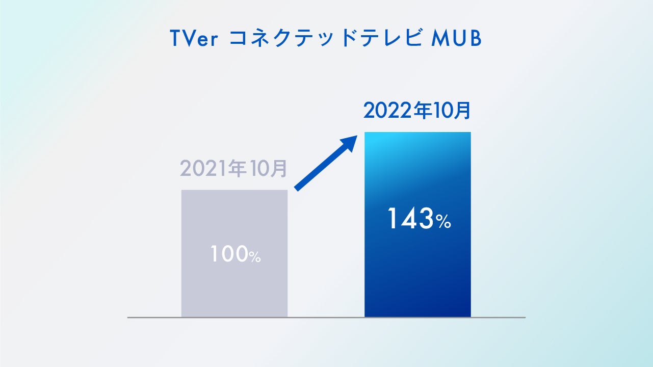 TVerでは2019年4月よりコネクテッドTV(以下、CTV)へ対応を開始し、対応端末の拡充はもとより、各端末のリモコンにワンボタンでTVerにアクセスできるアクセスボタンを設置するなど、利便性の向上に取り組んでおり、2022年10月のTVerにおけるCTVのMUBは前年同月比で143%と大きく伸長しています。