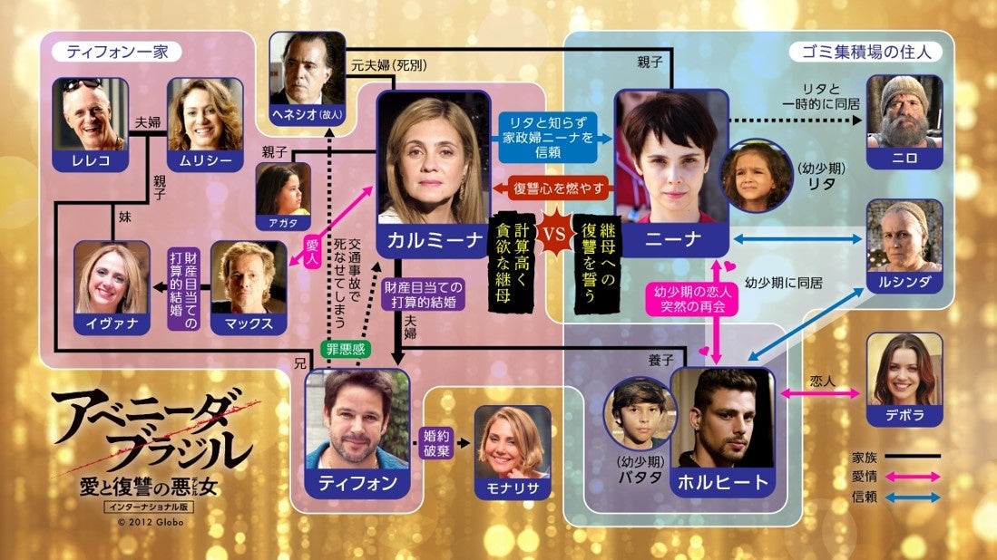 次々と明らかになる驚愕の人間関係や秘密の数々! ブラジルTV史上、驚異的な視聴率を記録し、国際エミー賞ベストドラマにもノミネートされた大人気作品のインターナショナル版がついに日本上陸。 過去と現在、愛と欲望、善意と悪意が絡み合う、究極のジェットコースター復讐劇が今始まる! ニーナは積年の恨みを晴らすことができるのか? そしてカルミーナの運命は・・・?! 全160話で制作されたオリジナル版を40話に凝縮したスピーディーな展開にイッキ見注意!