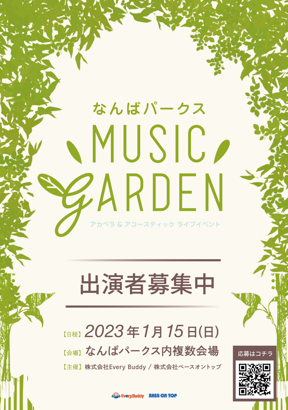 株式会社Every Buddy(本社:大阪市浪速区、代表取締役:松本恵/大橋優也)は、株式会社ベースオントップとコラボし、アマチュアのアカペラグループ、アコースティックバンドの出演者を募集、エントリーの中から選抜されたミュージシャンによるストリートガーデンライブ「なんばパークスMUSIC GARDEN」(Vol.1)を2023年1月15日(日)に開催致します。総勢50バンド以上が集結予定!? この規模のイベントは関西で初めてです。どうぞぜひご参加ください!