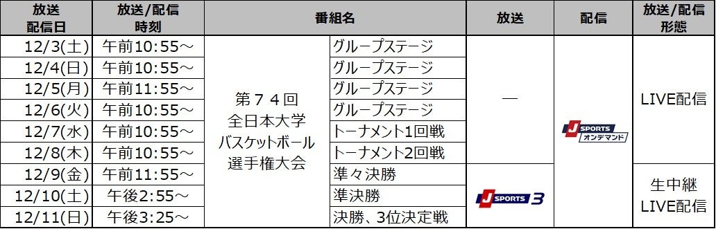 国内最大4チャンネルのスポーツテレビ局、株式会社ジェイ・スポーツ(本社 東京都江東区、代表取締役社長 長谷一郎、以下「J SPORTS」 ※1)は、12月3日(土)より12月11日(日)まで開催される「第74回全日本大学バスケットボール選手権大会」の男子全48試合をPC、スマホ、タブレットで見られる 「J SPORTSオンデマンド」 ※2にてLIVE配信いたします。また熱戦が期待される準決勝、3位決定戦、決勝の4試合は独占生中継/LIVE配信でお届けいたします。