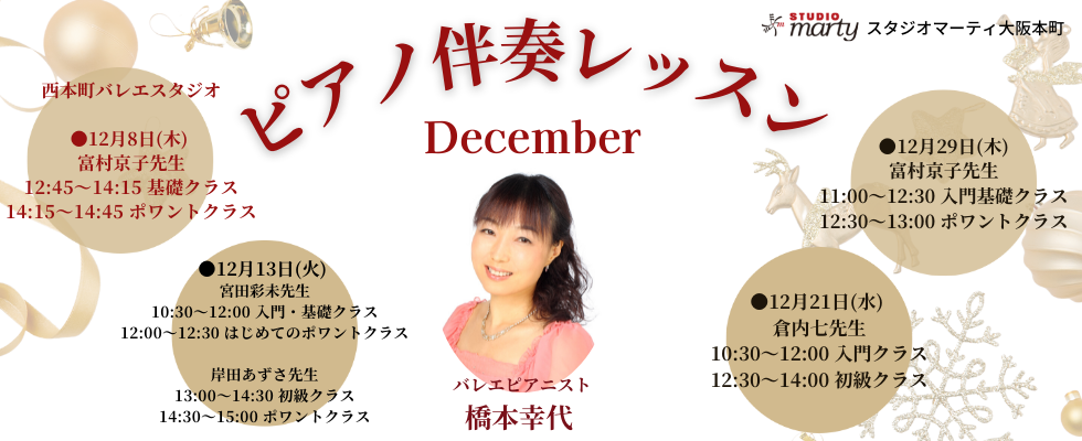 スタジオマーティ株式会社が運営するスタジオマーティ大阪本町と西本町バレエスタジオの2つのスタジオで、12月にピアノ伴奏つきクラスを開催することが決定しました!