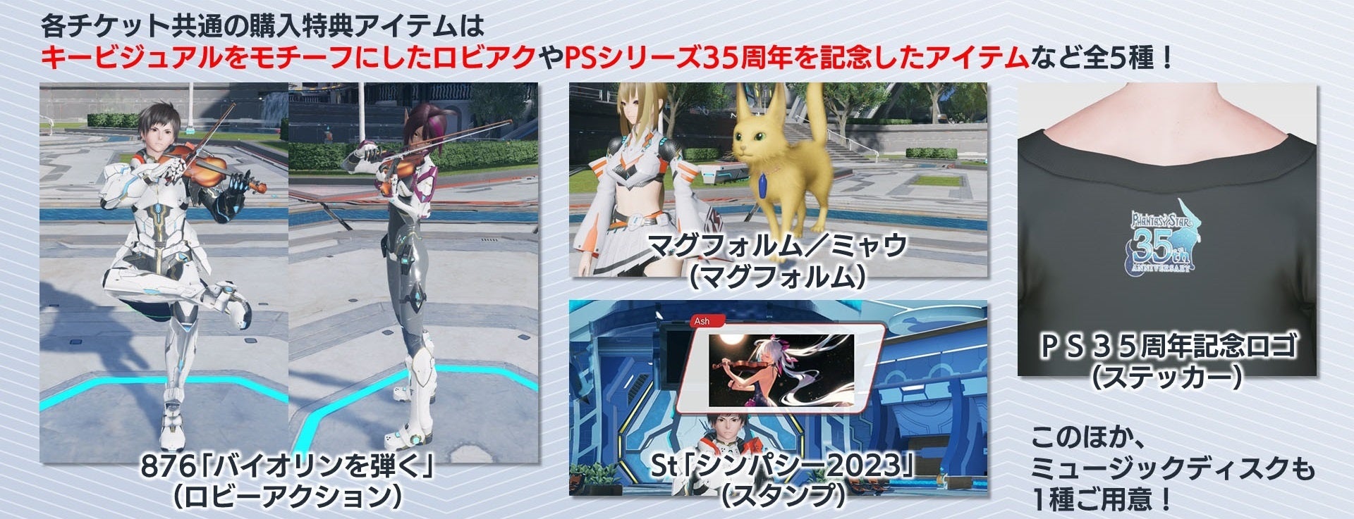 各チケット共通の購入特典アイテムコードで入手できるゲーム内アイテムが決定しました。アイテムは、キービジュアルをモチーフとしたロビーアクション「バイオリンを弾く」、「ファンタシースター」シリーズ35周年を記念したマグフォルム、ステッカーなど全5種類となっています。