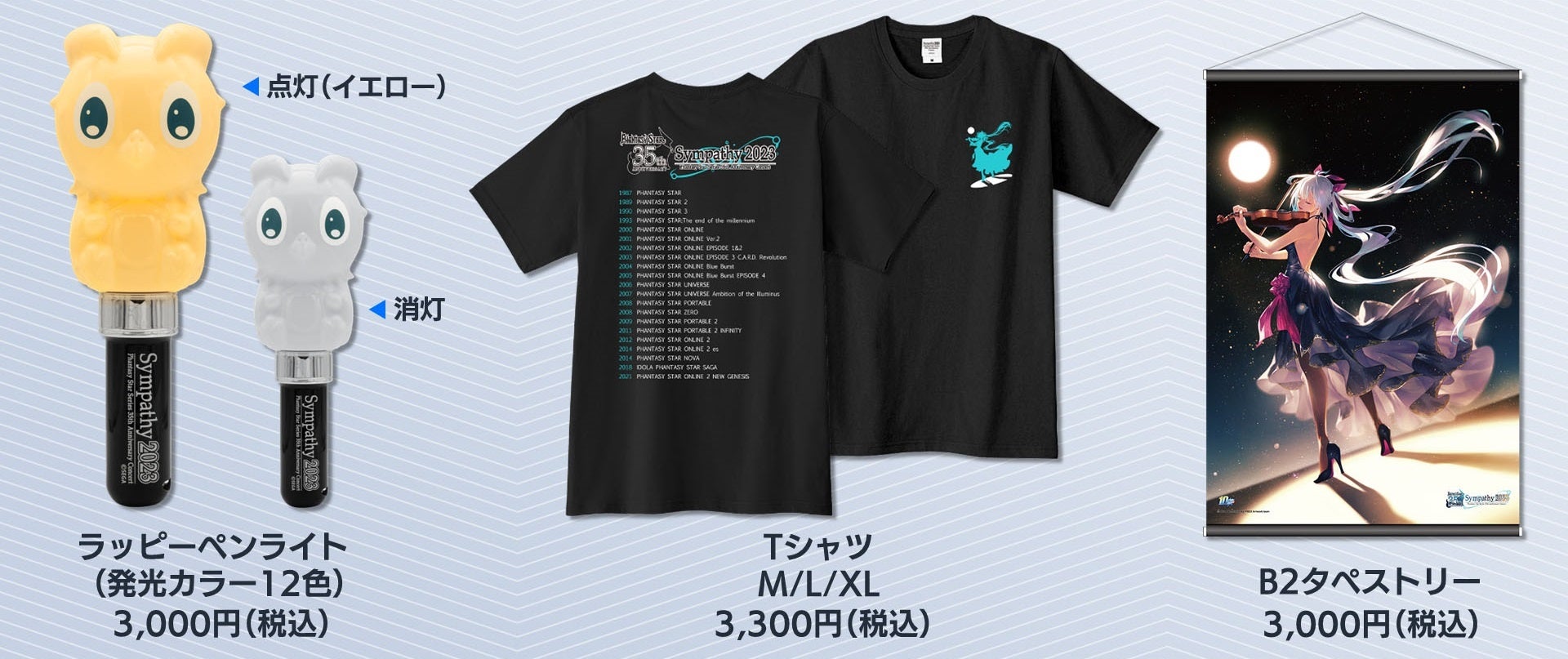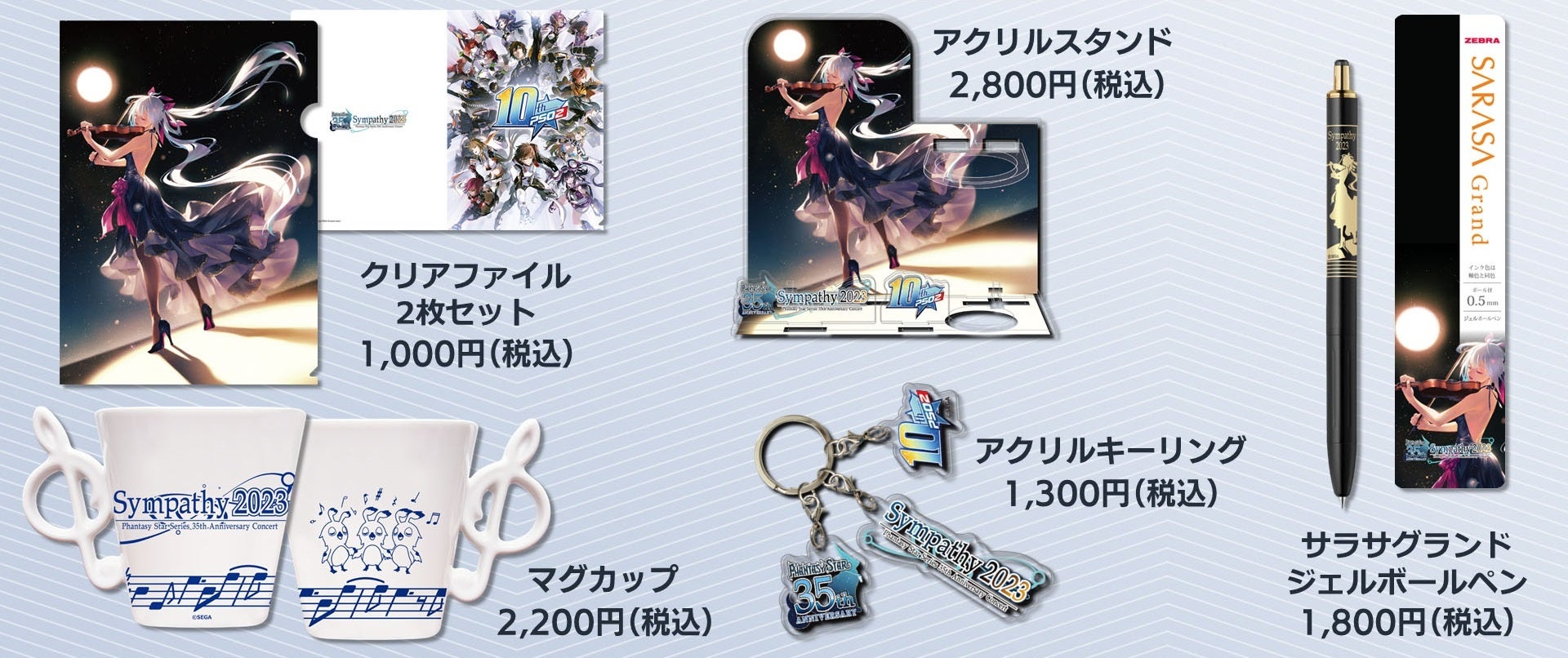 胸元にマトイのシルエットが入ったTシャツや、美麗なキービジュアルのB2タペストリー、記念イラストを使用したクリアファイル2枚セットや、『ファンタシースター』シリーズ35年の歴史を凝縮した魅力あるイラストが満載の卓上サイズのカレンダーなど、「シンパシー2023」をイメージしてデザインされたアイテムが多数登場します。