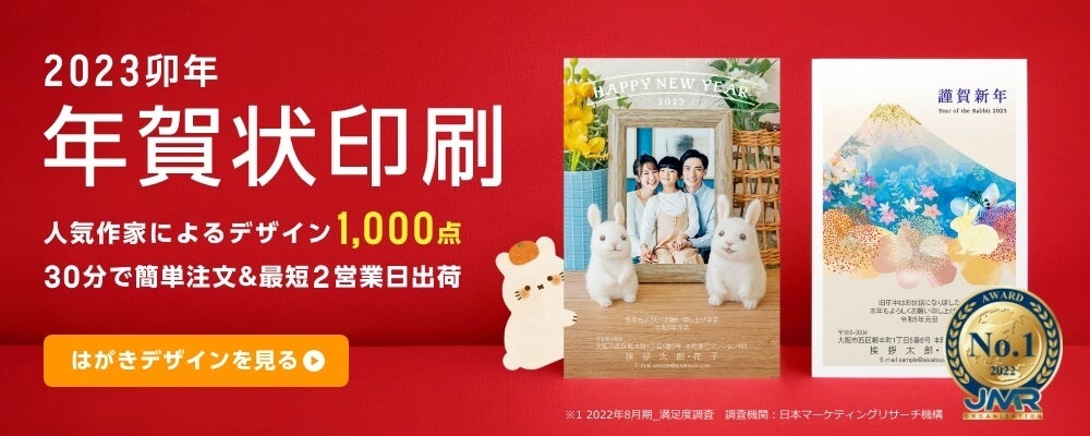 挨拶状ドットコムの年賀状印刷専門サイト。人気クリエイターが手がけた豊富なオリジナルデザインから好きな絵柄を選んで文章をレイアウトするだけで簡単に年賀状を作ることができます。累計で100万人以上の方にご利用いただけるようになった現在も、お客様の思いを形にし、大切にお届けしています。
