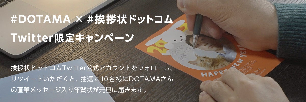 挨拶状ドットコムTwitter公式アカウントをフォローし、本キャンペーンのツイートをリツイートいただくと、抽選で10名様にDOTAMAさんの直筆メッセージ入り年賀状が元旦に届きます。キャンペーンの開催期間は2022年12月11日までとなります。