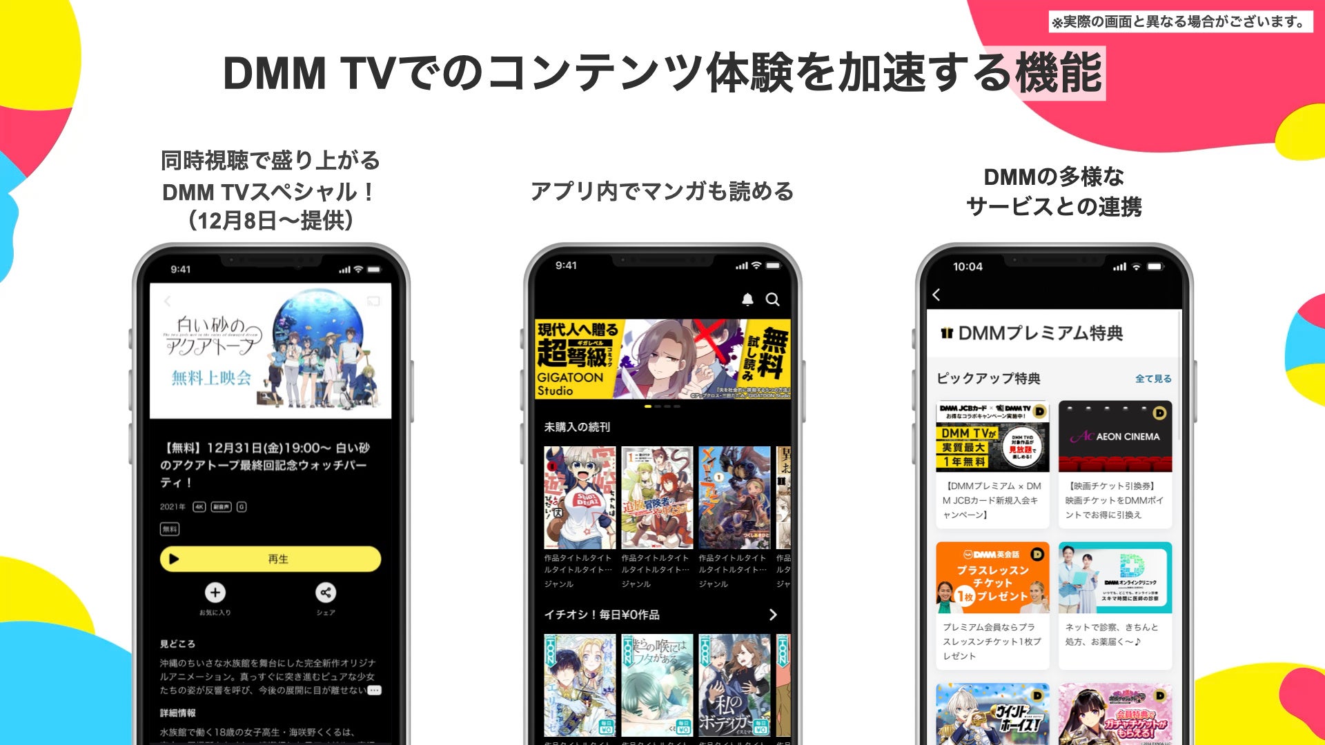 「DMM TV」では、いつでもどこでも楽しめるビデオオンデマンド形式による配信だけでなく、リアルタイム配信形式での番組提供もいたします。将来的には、同時視聴しているファン同士の交流を加速させるコメント機能などにも対応し、コンテンツを一緒に楽しむカルチャーをさらに盛り上げていきます。