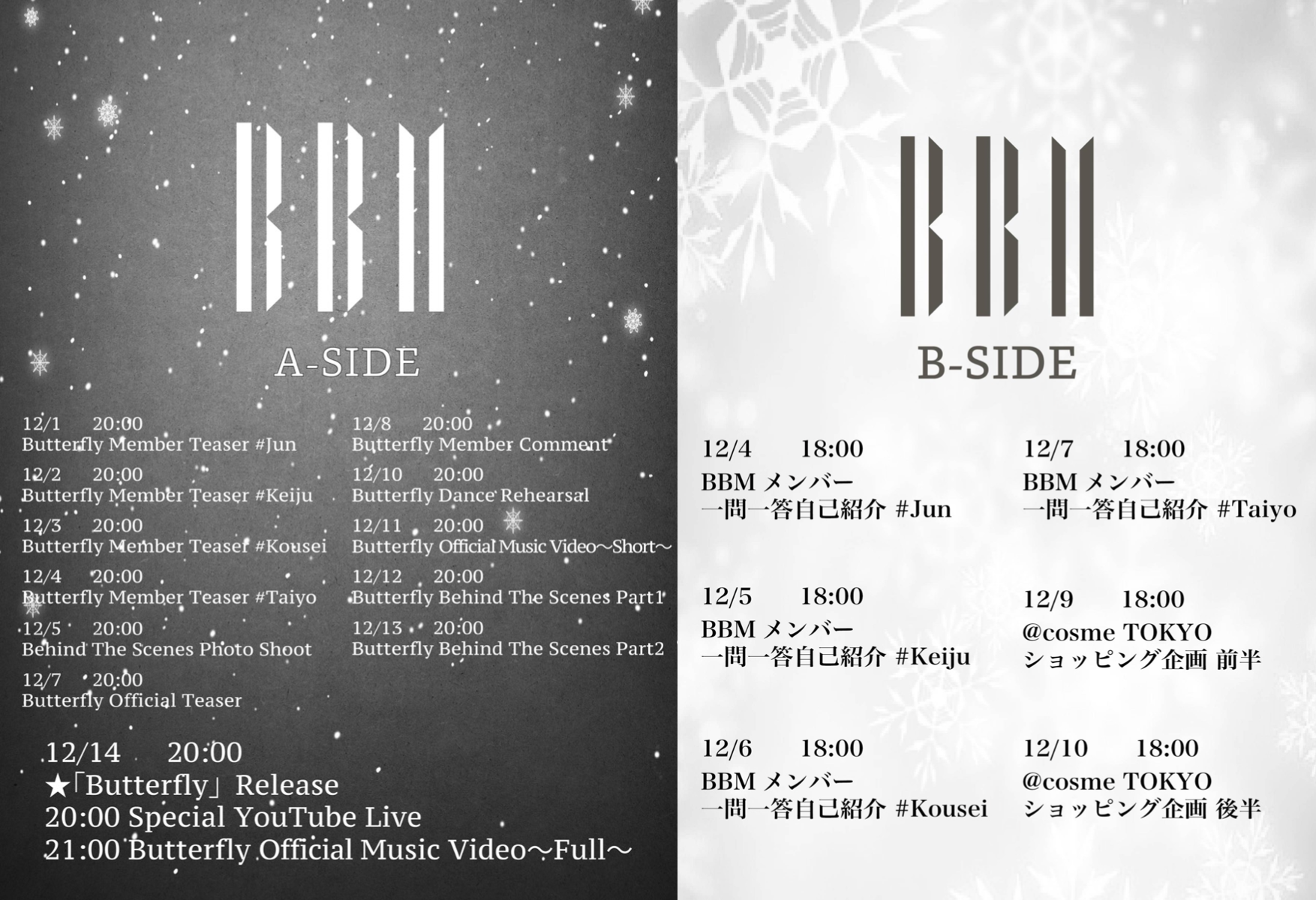 美容に特化した男性ボーカル&ダンスグループ「BBM(ビービーエム)」が、2022年12月14日のメジャーデビュー・デジタルシングル「Butterfly」リリースに向けて、本日12月1日にA-SIDEとB-SIDEの2つのスケジューラーを発表しました。A-SIDEはメンバーのソロティザーやメイキング、ダンスプラクティスなどの音楽に関するコンテンツ、B-SIDEは一問一答自己紹介や美容企画などより素顔に近いメンバーを見ることができるコンテンツとなっています。また、楽曲「Butterfly」は、フジテレビ系「魔女に言われたい夜」の12月度エンディングテーマにも決定いたしました。メジャーデビューまで約2週間のBBMに、ぜひご注目ください!