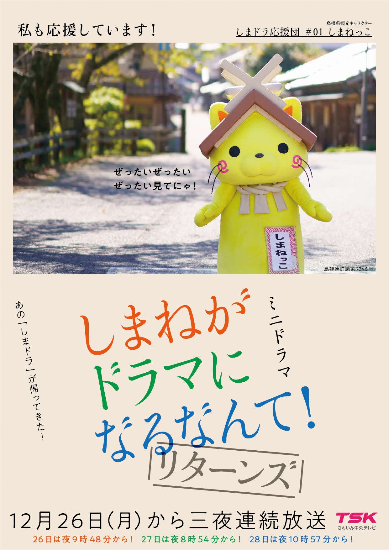 観光キャラクター「しまねっこ」をはじめとする、総勢25名の“しまドラ応援団”がポスターになってドラマを応援。抽選で前作DVDが当たるキャンペーンも。