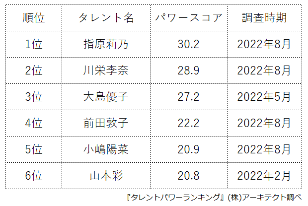 本ランキングは、2022年8月度に実施したタレント調査データ(一部過去実施データ)を利用し、タイトルに応じてランキング形式でまとめたものです。