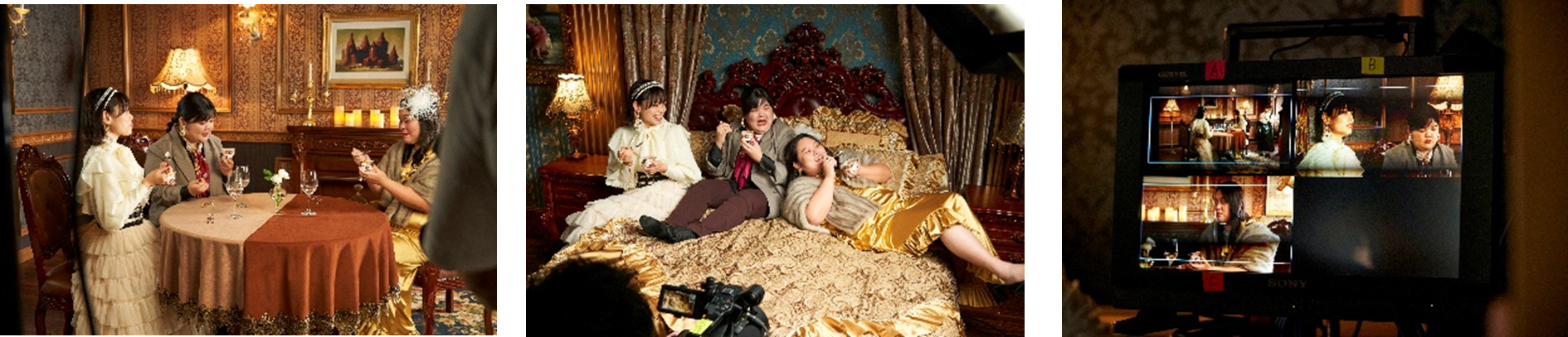 当日、初めて『ショコラ デュオ』を食べた「ぼる塾」の3人。「えー、すごーい、おいしくて笑えてくるー!」と大盛り上がりでした。スタジオでは、普段、楽屋でおやつを食べながらおしゃべりしているような自然な会話が続き、楽しい雰囲気の中で素敵な表情がたくさん撮れました。ドレスアップした衣装もとってもお似合いです。