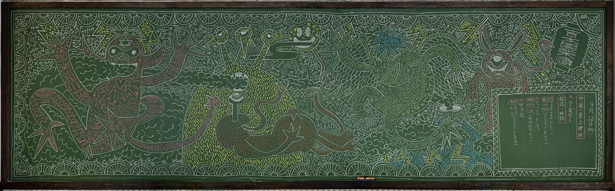 黒板アート作品「吉祥 〜宵の宴」。吉本興業の110周年を記念し、新宿本社ロビーの黒板に描かれた