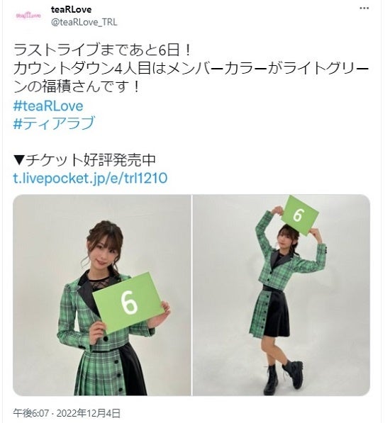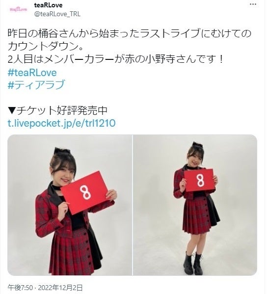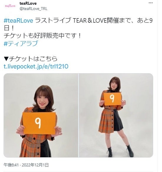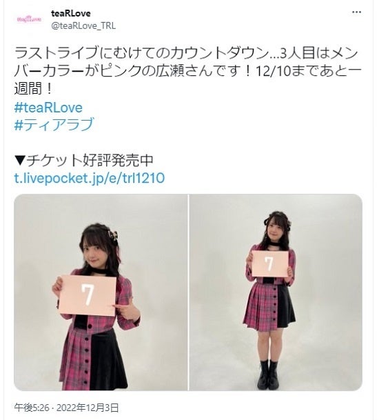 teaRLove公式Twitter(https://twitter.com/teaRLove_TRL)では、現在カウントダウン企画を実施中!メンバーがそれぞれのイメージカラーの衣装を纏い、12月10日行うラストライブに向けてカウントダウンを行っています。