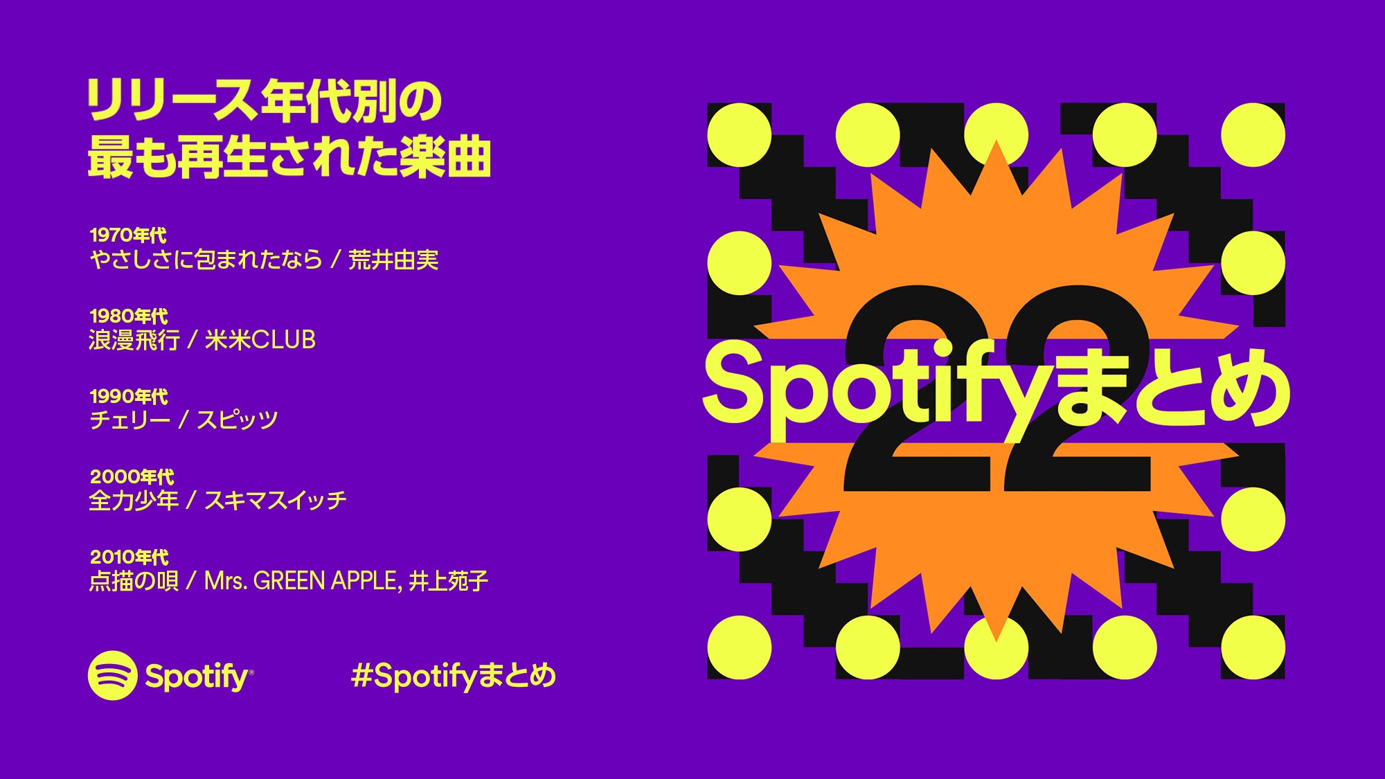 世界で4億5,600万人以上のユーザーが利用するオーディオストリーミングサービスSpotify(会社名 Spotify A B / 本社 Stockholm, Sweden)は、本日、2022年に海外で再生された日本の音楽ランキング、ならびにリリース年代別に最も再生された楽曲ランキングを発表いたしました。