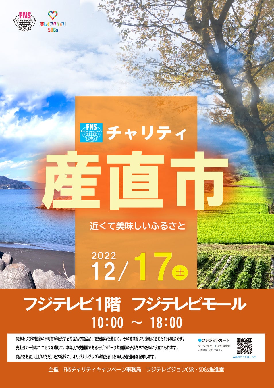 12月17日(土)にフジテレビ社屋1F「フジテレビモール」にて、「FNSチャリティ産直市」を開催し、関東圏を中心に自治体や地場産業を中心に出展していただき、地域の特産品の販売と地域情報を発信し、1日の総売上の一部をモザンビークの恵まれない子どもたちへの支援に役立てます。海外の恵まれない子どもたちを支援する「チャリティ」と、地域の特産品をPRする「地方創生」(町おこし)の両立を図り、新しい社会貢献の形を目指します。