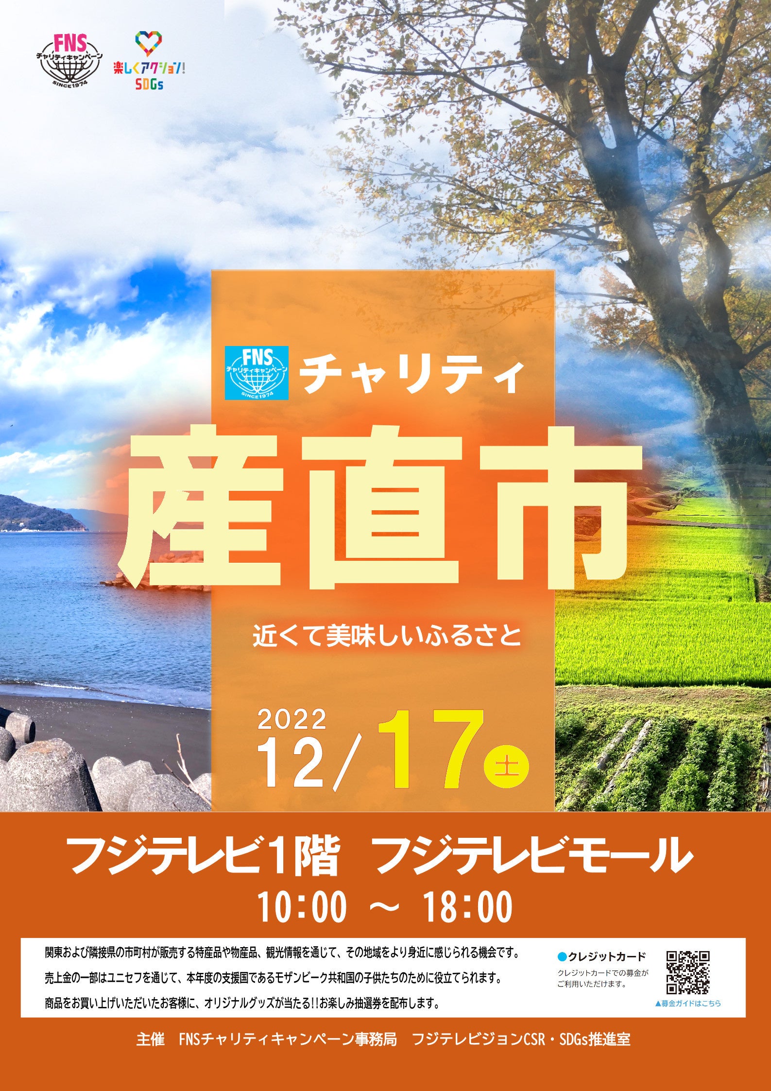 12月17日(土)にフジテレビ社屋1F「フジテレビモール」にて、「FNSチャリティ産直市」を開催し、関東圏を中心に自治体や地場産業を中心に出展していただき、地域の特産品の販売と地域情報を発信し、1日の総売上の一部をモザンビークの恵まれない子どもたちへの支援に役立てます。海外の恵まれない子どもたちを支援する「チャリティ」と、地域の特産品をPRする「地方創生」(町おこし)の両立を図り、新しい社会貢献の形を目指します。