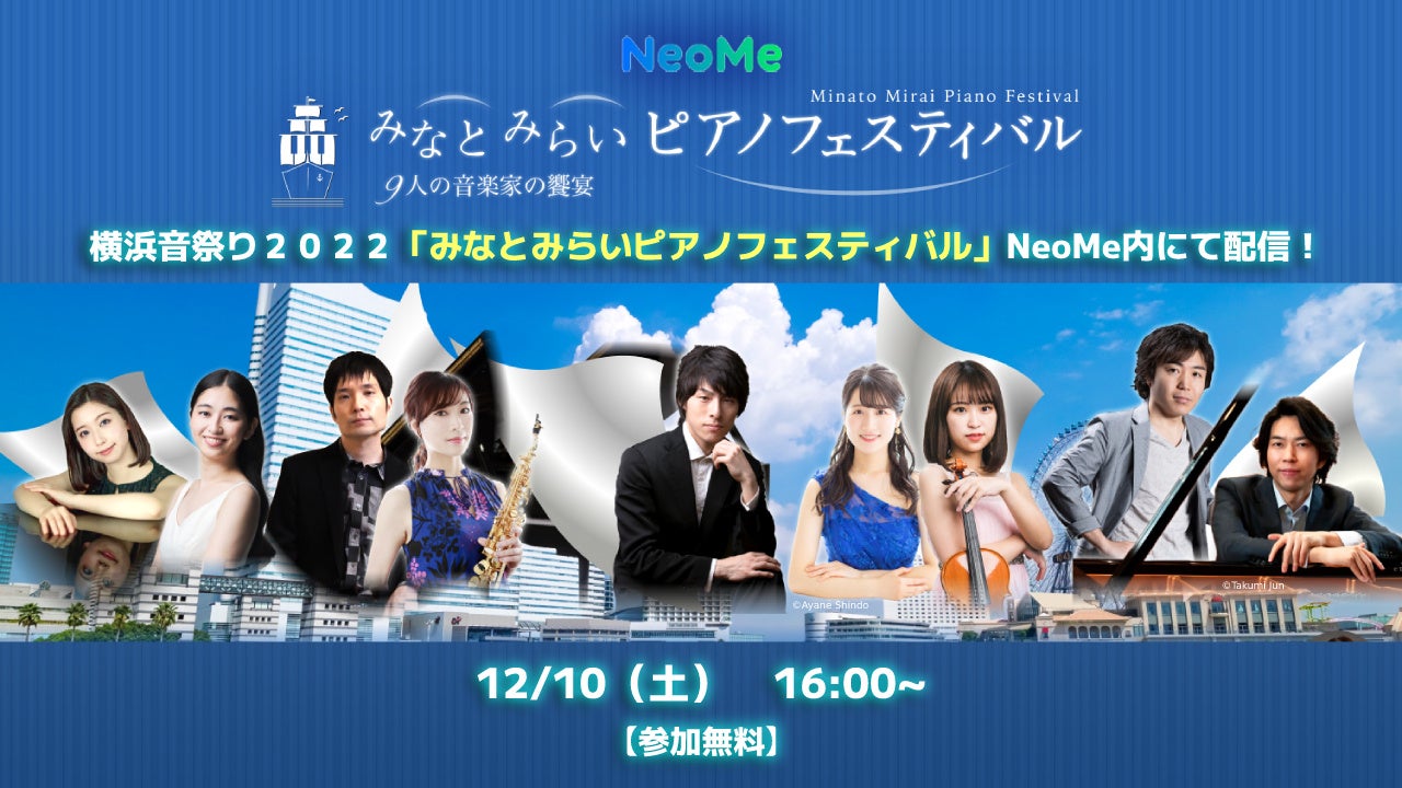 ぴあ株式会社(本社:東京都渋谷区、代表取締役社長:矢内廣)が運営するバーチャルライブアプリ「NeoMe」では、11/6(日)にみなとみらいクイーンズスクエア横浜1階 クイーンズサークルにて行われた「みなとみらいピアノフェスティバル」について、当日の模様を12/10(土)に配信いたします。