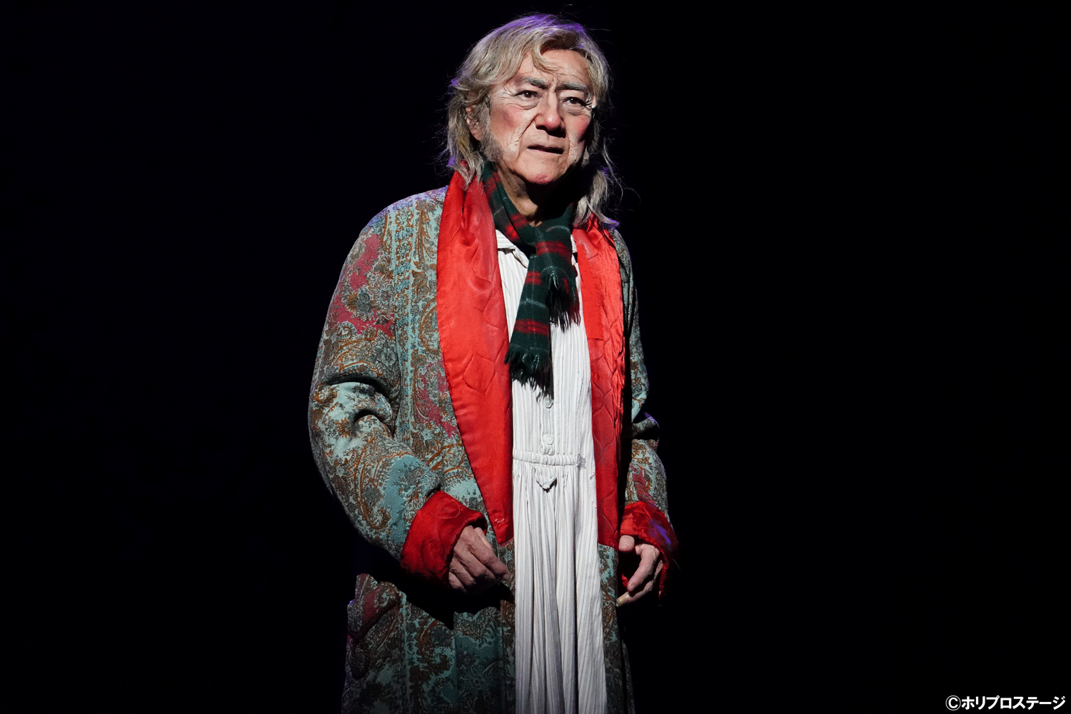 1994年の日本初演以来、今回で3年振り7度目の主演スクルージ役を務める市村正親。来年には役者生活50周年を迎える73歳とは思えない程のパワーで、舞台上を始終駆け回り、飛び、全身を使って喜怒哀楽を表現していく。