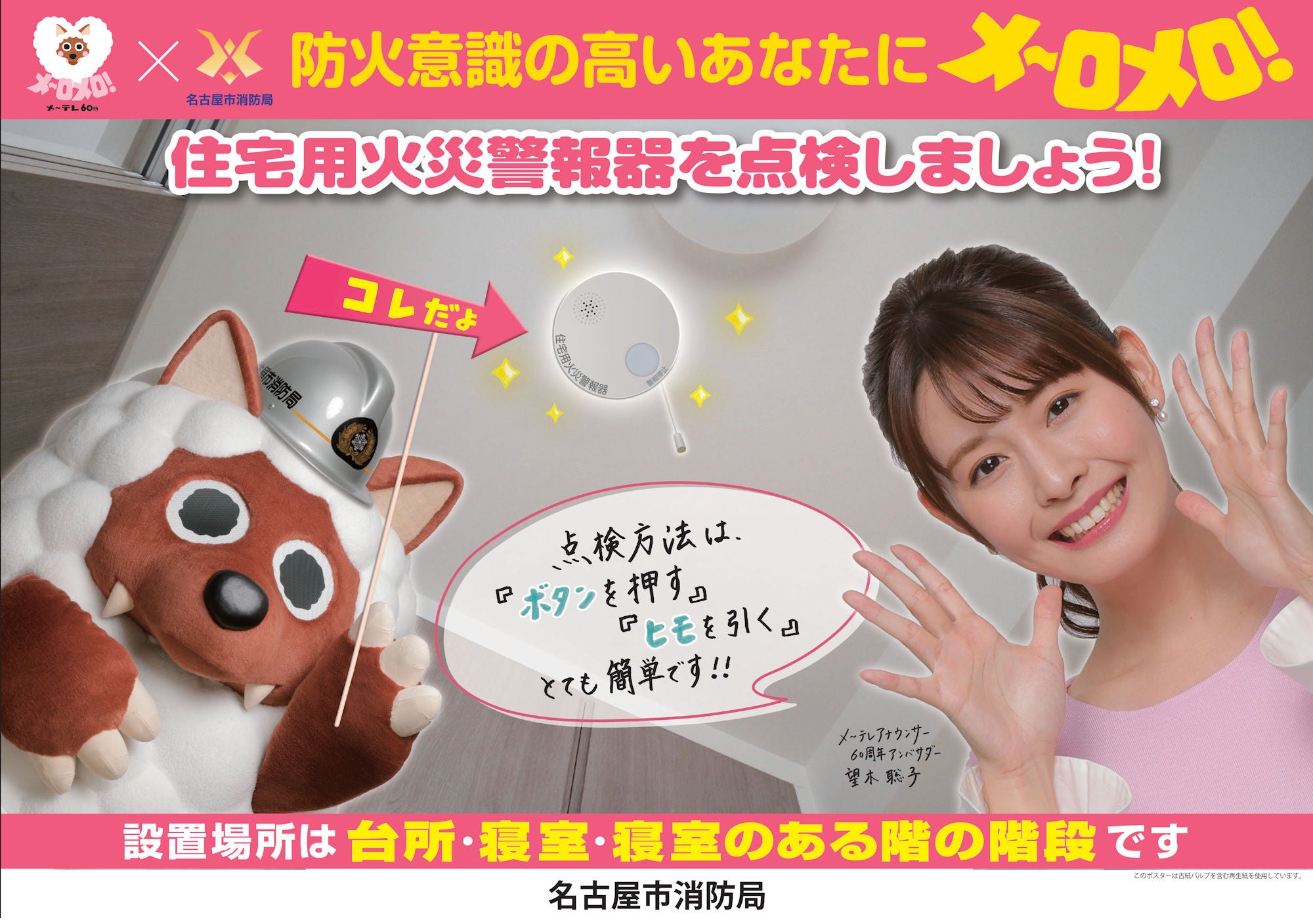 「火事のない街になるお手伝いをしたい」 60周年のメ~テレは名古屋市消防局とコラボして、防火の啓発活動を続けています。住宅用火災警報器の点検を呼びかけるポスターに望木アナ&ウルフィが出演したり、「ウルフィキャラバン」で幼稚園をまわり、子ども達に火事の怖さや防火の大切さを伝える活動を続けたりしています。