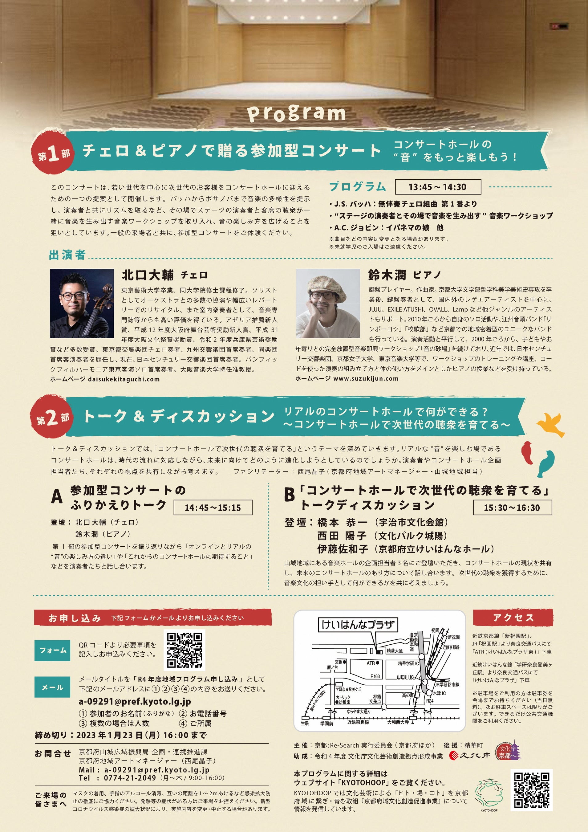 演奏・登壇|北口大輔(チェロ)/鈴木潤(ピアノ)/橋本恭一(宇治市文化会館)/西田陽子(文化パルク城陽)/伊藤佐和子(京都府立けいはんなホール)