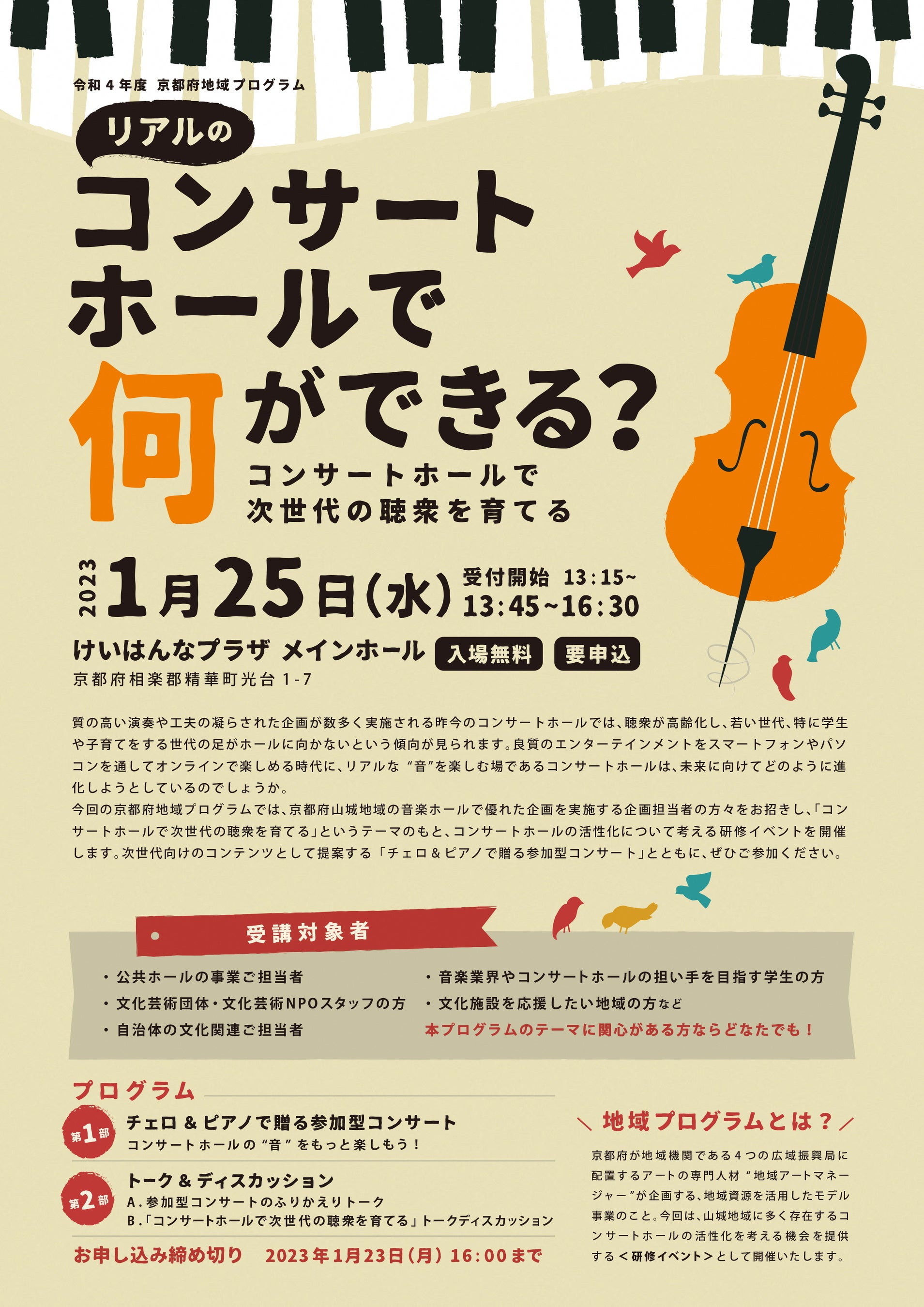 京都府山城地域の音楽ホールで優れた企画を実施する企画担当者の方々をお招きし、「コンサートホールで次世代の聴衆を育てる」というテーマのもと、コンサートホールの活性化について考える研修イベントを開催します。イベント内では、次世代向けのコンテンツとして提案する「チェロ&ピアノで贈る参加型コンサート」も開催。「生の音を楽しむ」場であるコンサートホールについて、再発見・再考をしに、お誘い合わせの上ぜひご参加ください。