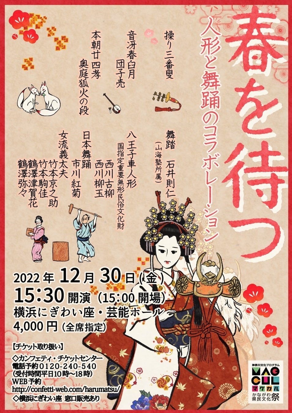 アンプリ企画主催、『春を待つ~人形達による景事への誘い~』が2022年12月30日(金)に横浜にぎわい座(神奈川県横浜市中区野毛町3丁目110番1号)にて上演されます。