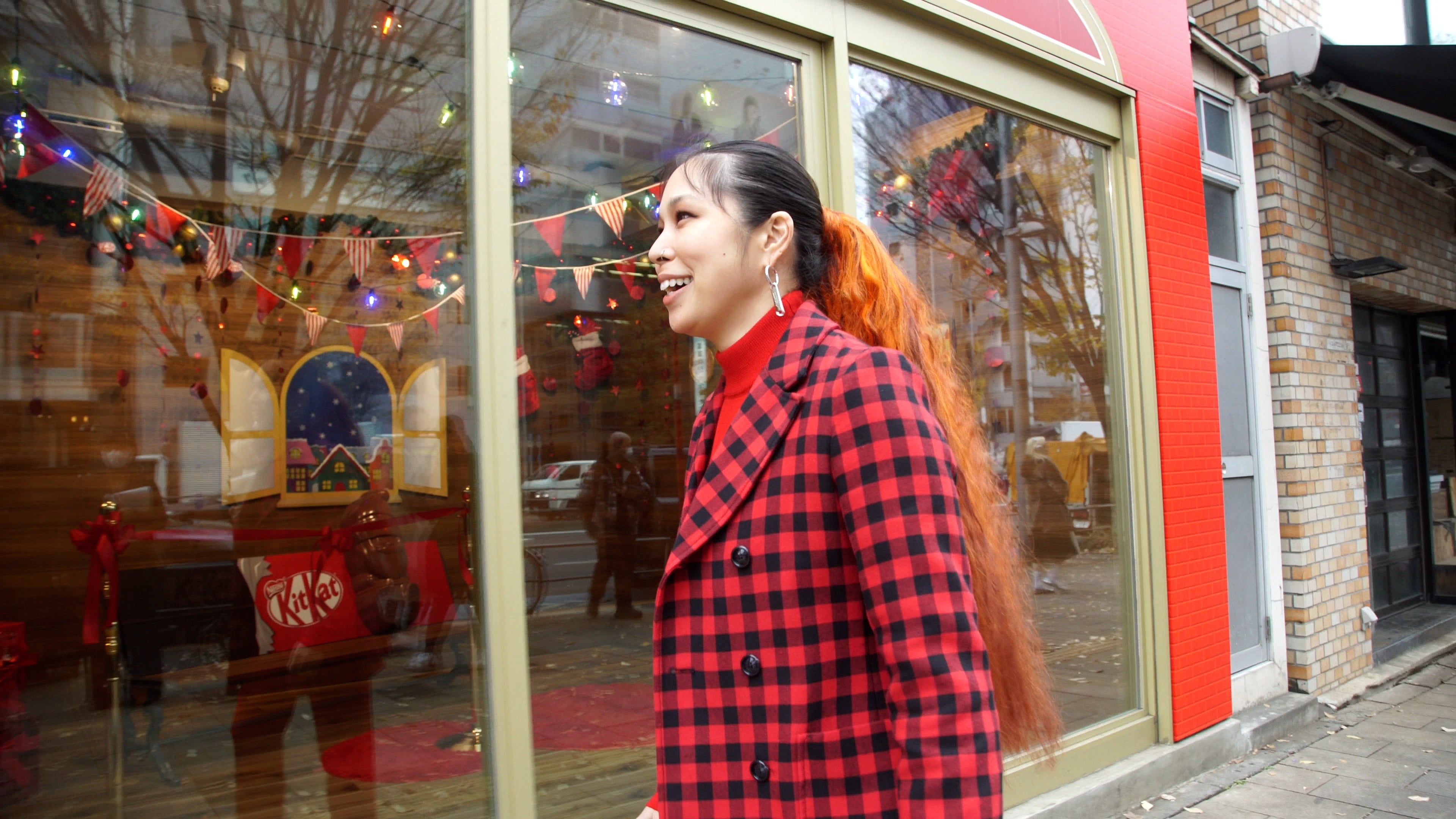 そして、ツリーの隣には高さ75cmの特大「ホリデイサンタ」と一緒に写真撮影ができる「キットカット」ベンチもお目見え。「ツリーがあるとクリスマス気分も盛り上がるし、オーナメントが食べられるなんて最高。ベンチにも“キットカット”のロゴが映えているし、このサンタと一緒に写真が撮れるのは特別感がありますよね」とコメントを寄せながら、スマホでの自撮りを楽しんでいました。
