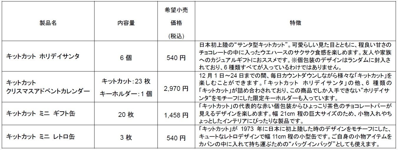 当ショップでは、以下の4商品を販売します。なお、「キットカット ホリデイサンタ」は、1日あたりの販売数量に限りがあるので、当日無くなり次第販売終了とさせていただきます。あらかじめご了承ください。
