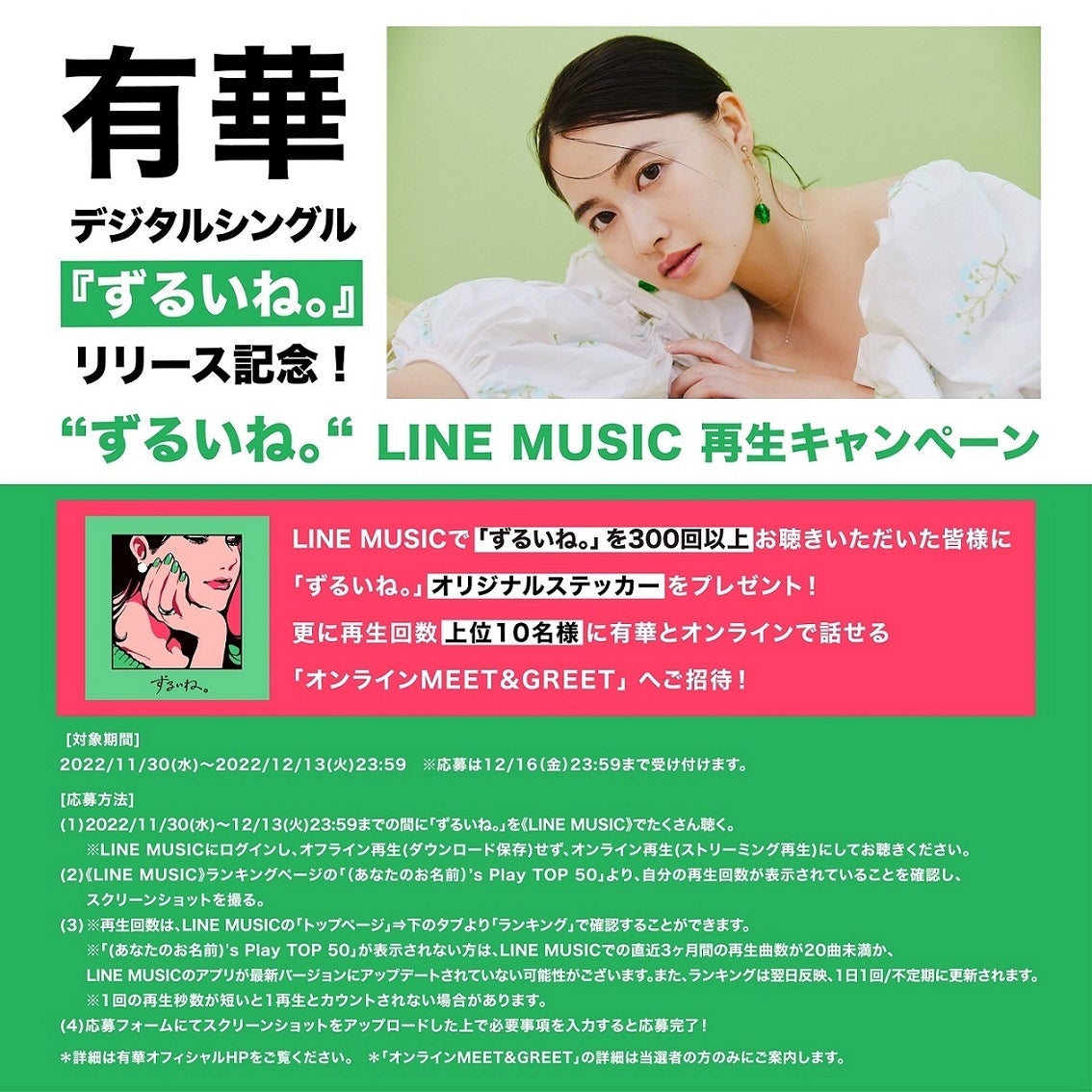 LINE MUSICでは「ずるいね。」を300回以上お聴きいただいた皆様に「ずるいね。」オリジナルステッカーをプレゼント、たくさん聞いてくれた上位10名様に、有華とオンラインで話せる「オンラインMEET & GREET」に招待する「ずるいね。」キャンペーンも12/13(火)23:59まで開催しているので要チェック!