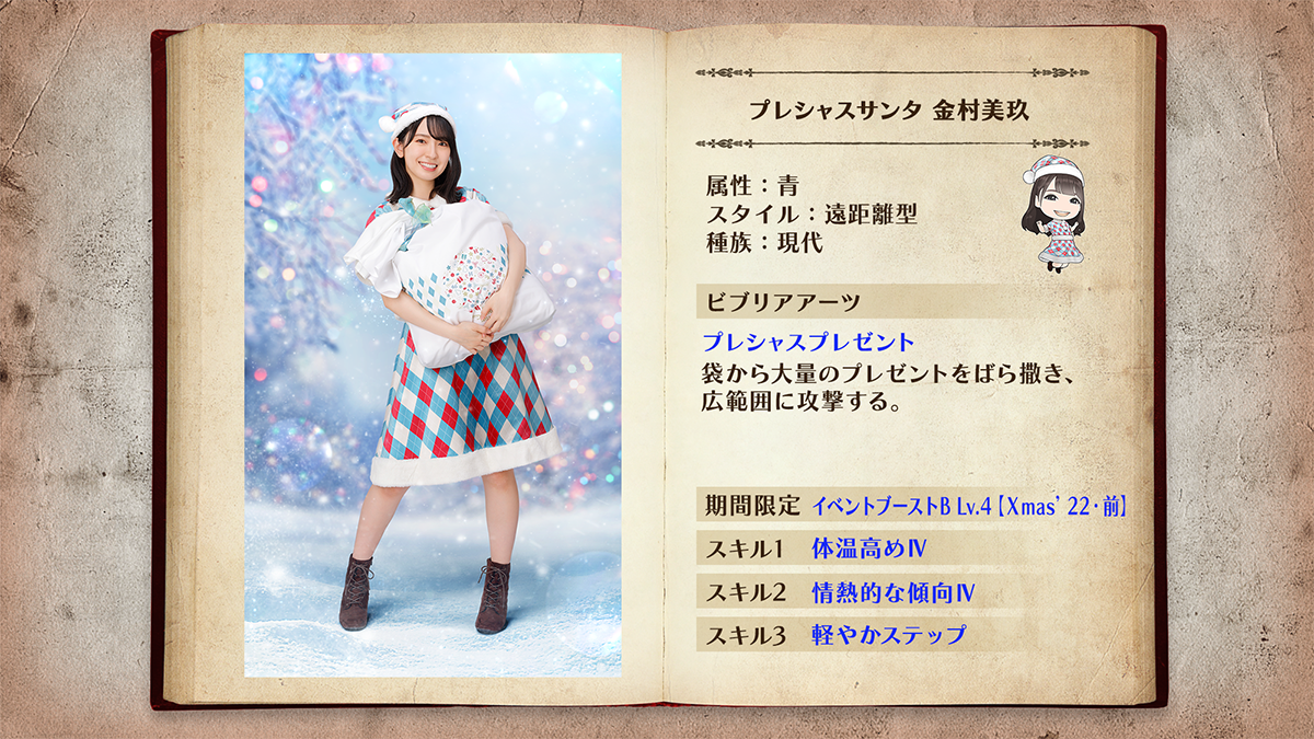 「★4 ハピネスサンタ♭ 佐々木美玲」はパーティ内の「ホーリーサンタ」「ハピネスサンタ」「プレシャスサンタ」ユニットを強化する効果持ち!