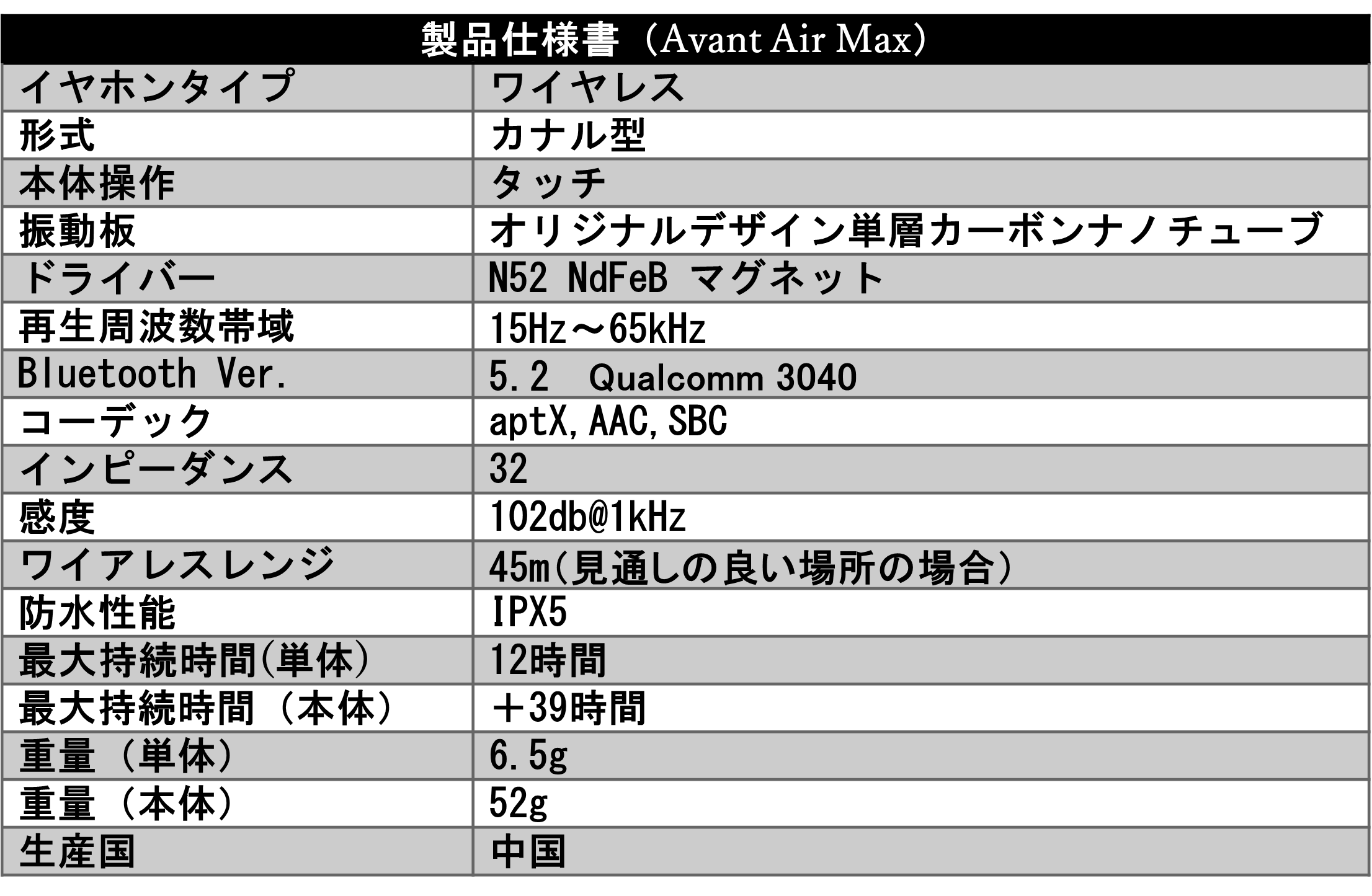 AVANT AIR MAXは明確、明瞭、そして躍動……と、音楽のわくわくする愉しさを体験できる、完全ワイヤレスイヤホンだ。その象徴が、世界で初めて独自の単層カーボンナノチューブ振動板を採用したことだ。カーボンナノチューブ振動板は音速が速い(6300m/s)、高剛性、内部損失が高いという理想的な良いスピーカーの条件を備えており、特に多層に比べて単層の特性は高い。
