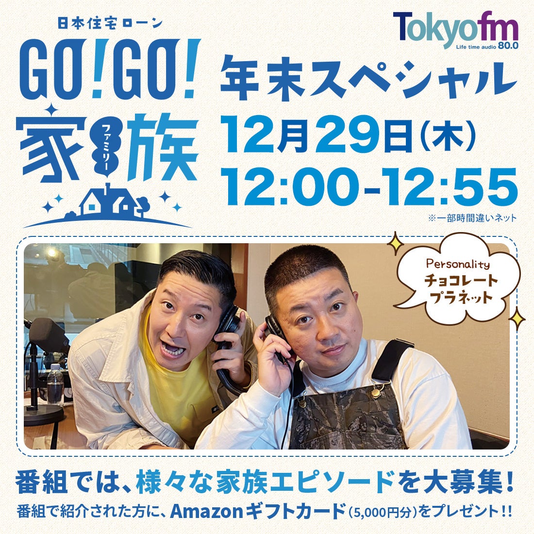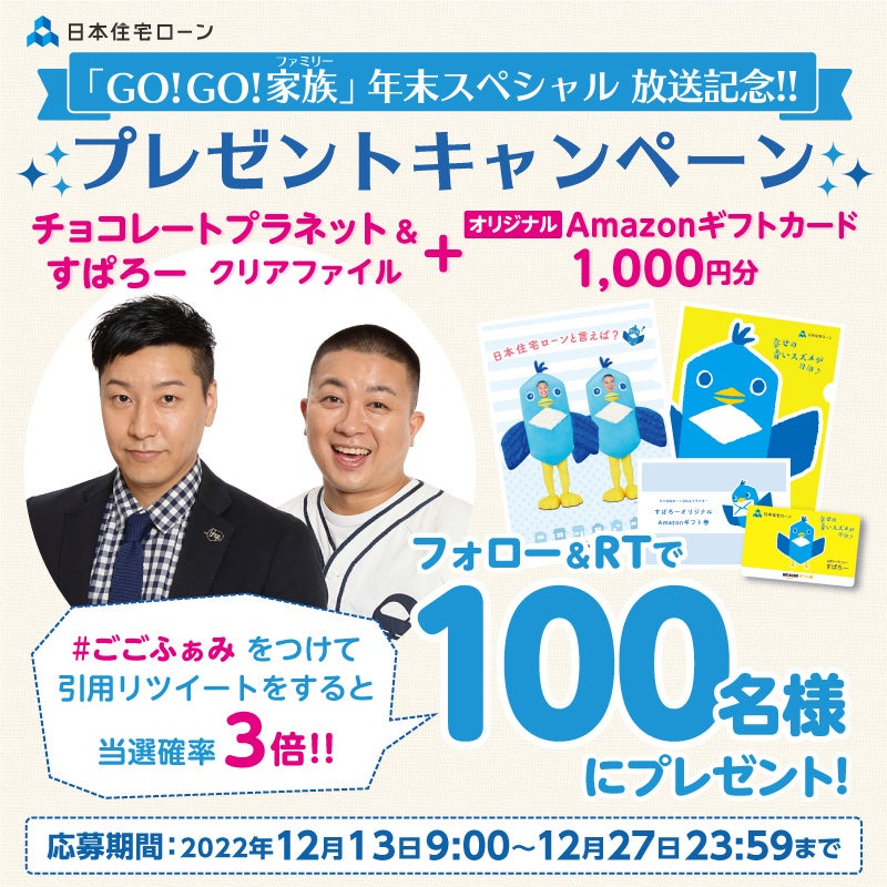 日本住宅ローン株式会社(本社:東京都渋谷区 代表執行役社長:安藤 直広 以下日本住宅ローン)は、人気お笑いコンビ チョコレートプラネットがパーソナリティを務める、当社スポンサーのラジオ番組「GO!GO!家族(ファミリー)」の年末スペシャルの放送を記念して、2022年12月27日(火)まで公式Twitterにて「日本住宅ローン「GO!GO!家族」年末スペシャル放送記念キャンペーン」 を実施します。