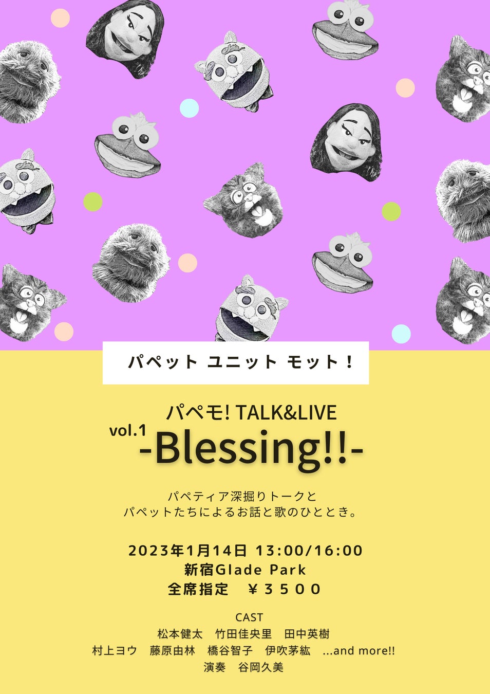パペット ユニット モット!『パペモ! TALK&LIVE vol.1 -Blessing!!-』が2023年1月14日(土)に新宿Gladepark(東京都新宿区)にて開催されます。チケットはカンフェティ(運営:ロングランプランニング株式会社、東京都新宿区、代表取締役:榑松 ⼤剛)にて12月16日(金)より発売開始です。