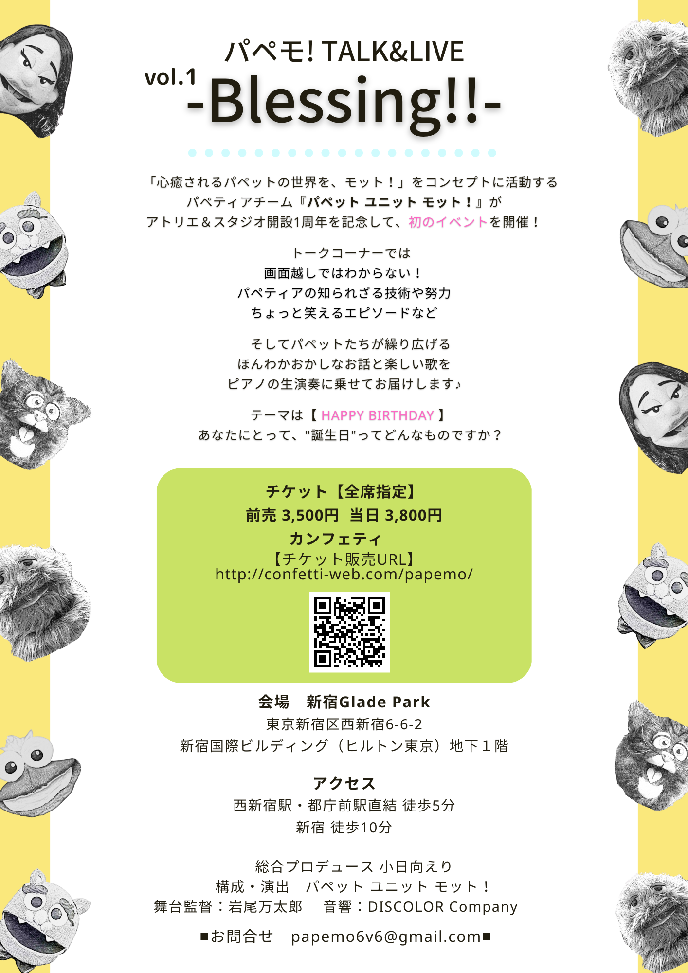 パペット ユニット モット!『パペモ! TALK&LIVE vol.1 -Blessing!!-』が2023年1月14日(土)に新宿Gladepark(東京都新宿区)にて開催されます。チケットはカンフェティ(運営:ロングランプランニング株式会社、東京都新宿区、代表取締役:榑松 ⼤剛)にて12月16日(金)より発売開始です。