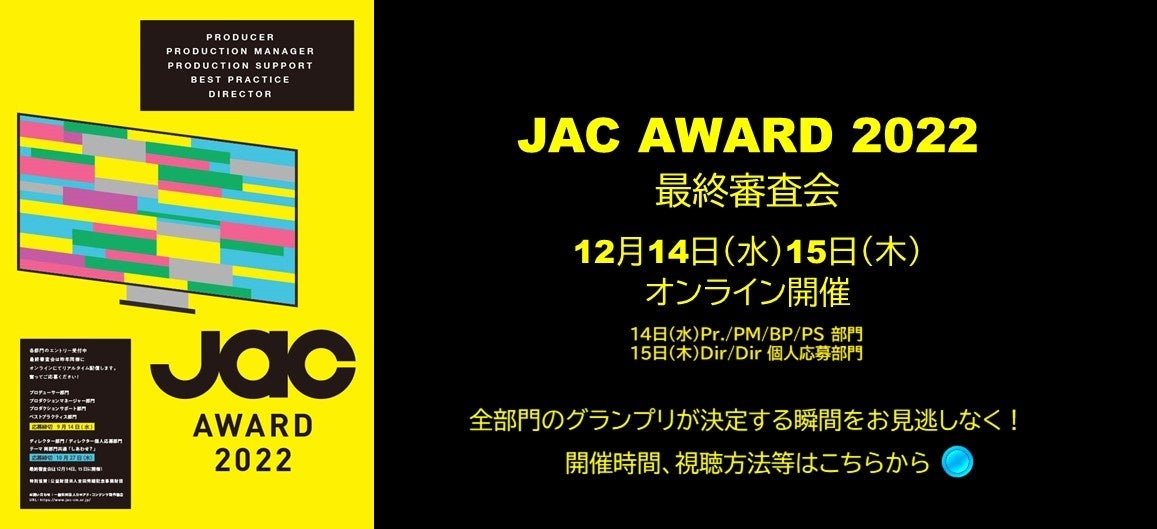 さらに当日はプロデューサー・プロダクションマネージャー部門/プロダクションサポート部門において、弊社COO佐藤が最終審査員として参加いたします。ぜひご参加ください。※本番組の視聴は、JAC会員社限定となります。