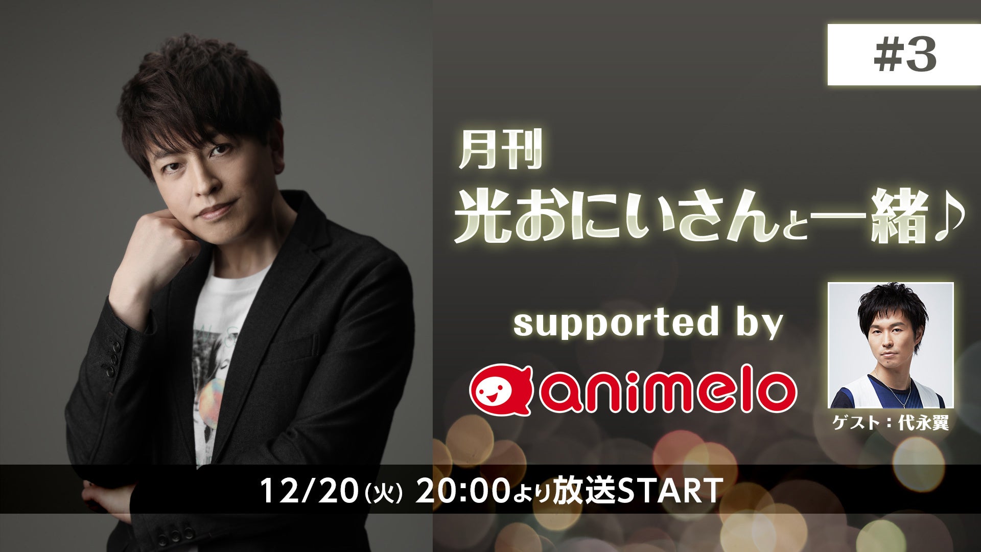 12月20日(火)の第3回放送では、月刊レギュラー放送化してから2人目のゲスト、声優の代永翼さんをお招きし、共演作品についての話や、お互いの好きなものを紹介しあうなど、お二人のトークを中心にお届けします。