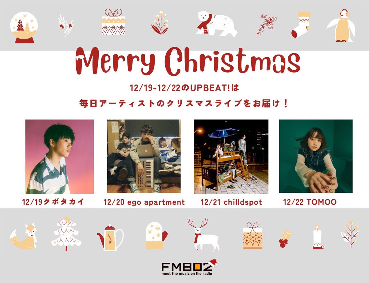 クボタカイ/ego apartment/chilldspot/TOMOOが登場。それぞれにクリスマスの名曲をカバーしてくれます。