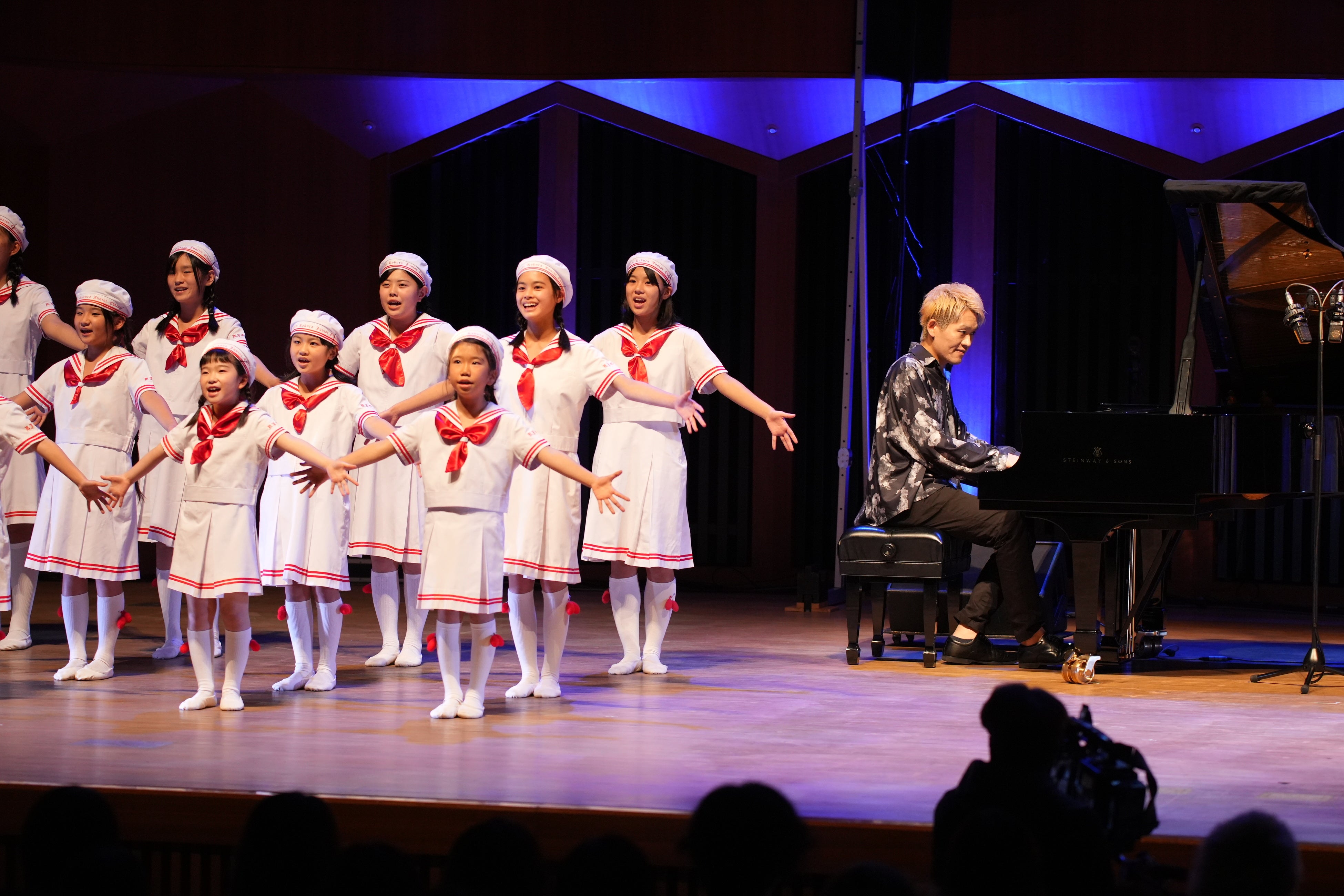 前半の最後にはスペシャルステージとして、北九州市民に親しまれている地元合唱団「小倉少年少女合唱団」が登場。みやけんさんの演奏に合わせて「銀河鉄道999」を可愛らしい振り付けと共に合唱していただきました。会場からの手拍子による声援、笑顔で伴奏されるみやけんさん、そして子どもたちの元気いっぱいな歌声に心温まるステージとなりました。