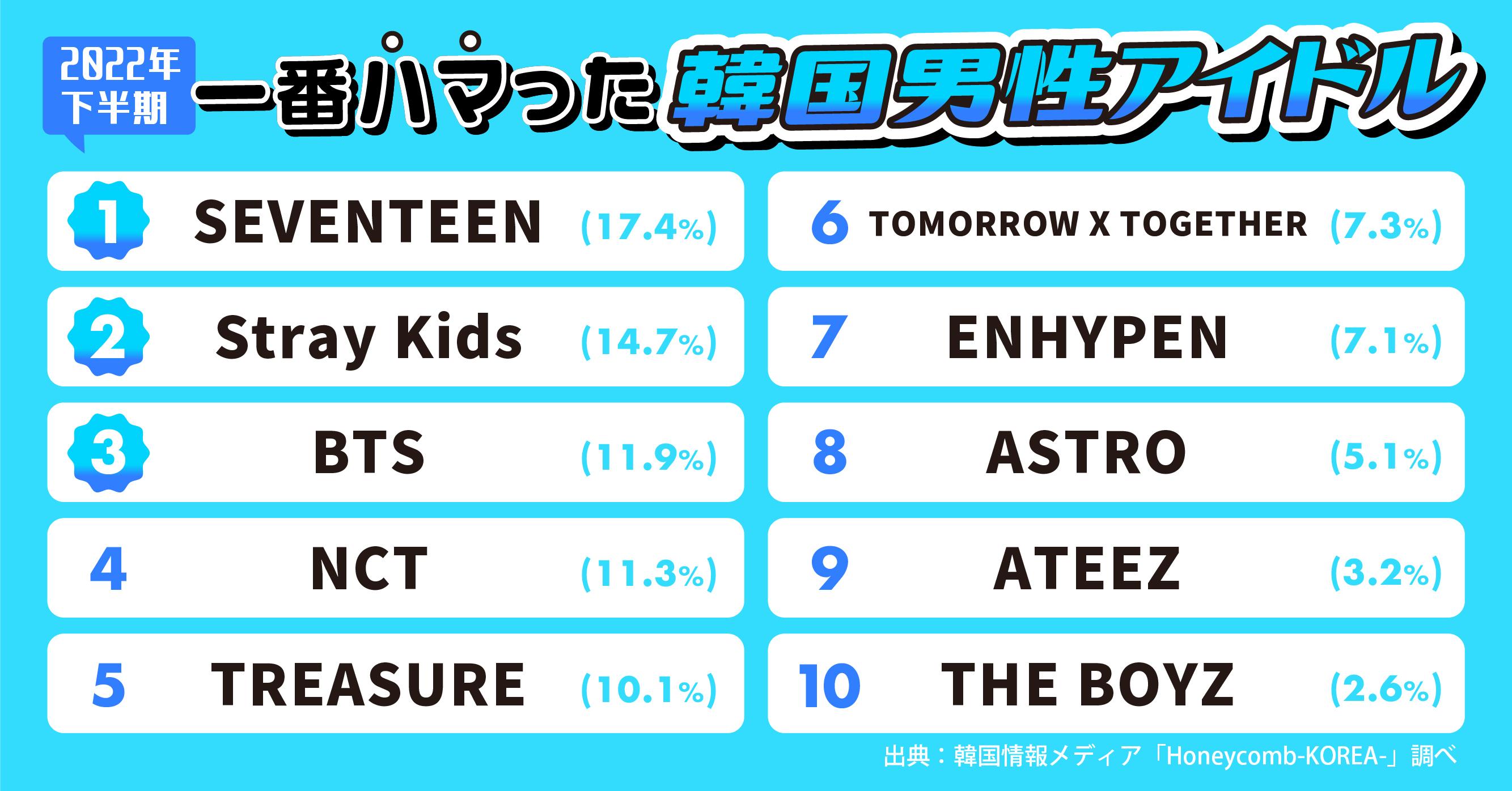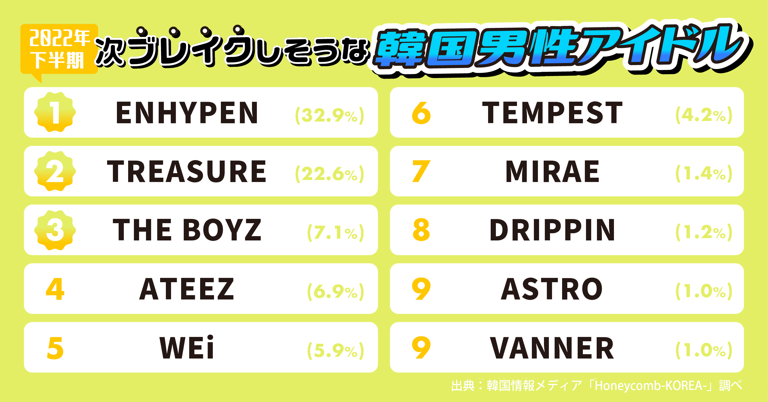 「BTS」を輩出した韓国の総合エンターテインメント企業「HYBE」から2020年にデビューした「ENHYPEN(エンハイプン/エンハイフン)」が、ブレイクしそうな韓国男性アイドル第1位という結果に。過酷すぎると話題になった、韓国のサバイバルオーディション番組『I-LAND(アイランド)』から生まれた7人組ボーイズグループで、日本人を含む多国籍なメンバーで構成されています。デビュー後初となるワールドツアー「ENHYPEN WORLD TOUR ‘MANIFESTO’」も今年9月より開催されており、これからの活躍にも注目が集まっています。