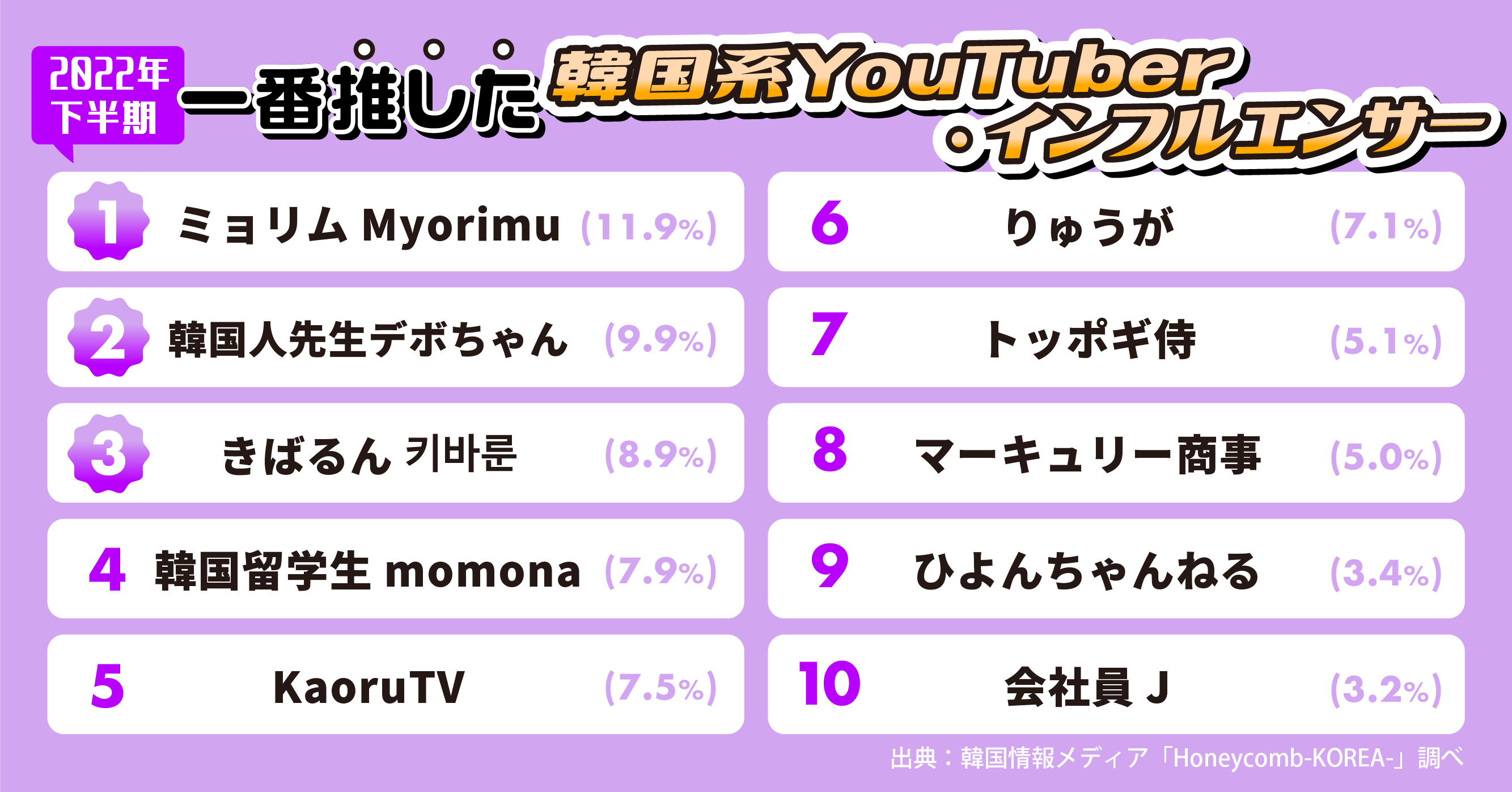 第2位には、日本で暮らす韓国人として活動し、親しみやすいキャラクターで人気を得ている「韓国人先生デボちゃん」、第3位には韓国エンタメ情報や、日韓文化の違いなど、韓国をテーマに幅広いジャンルの動画を配信している「きばるん 키바룬」がランクインしました。