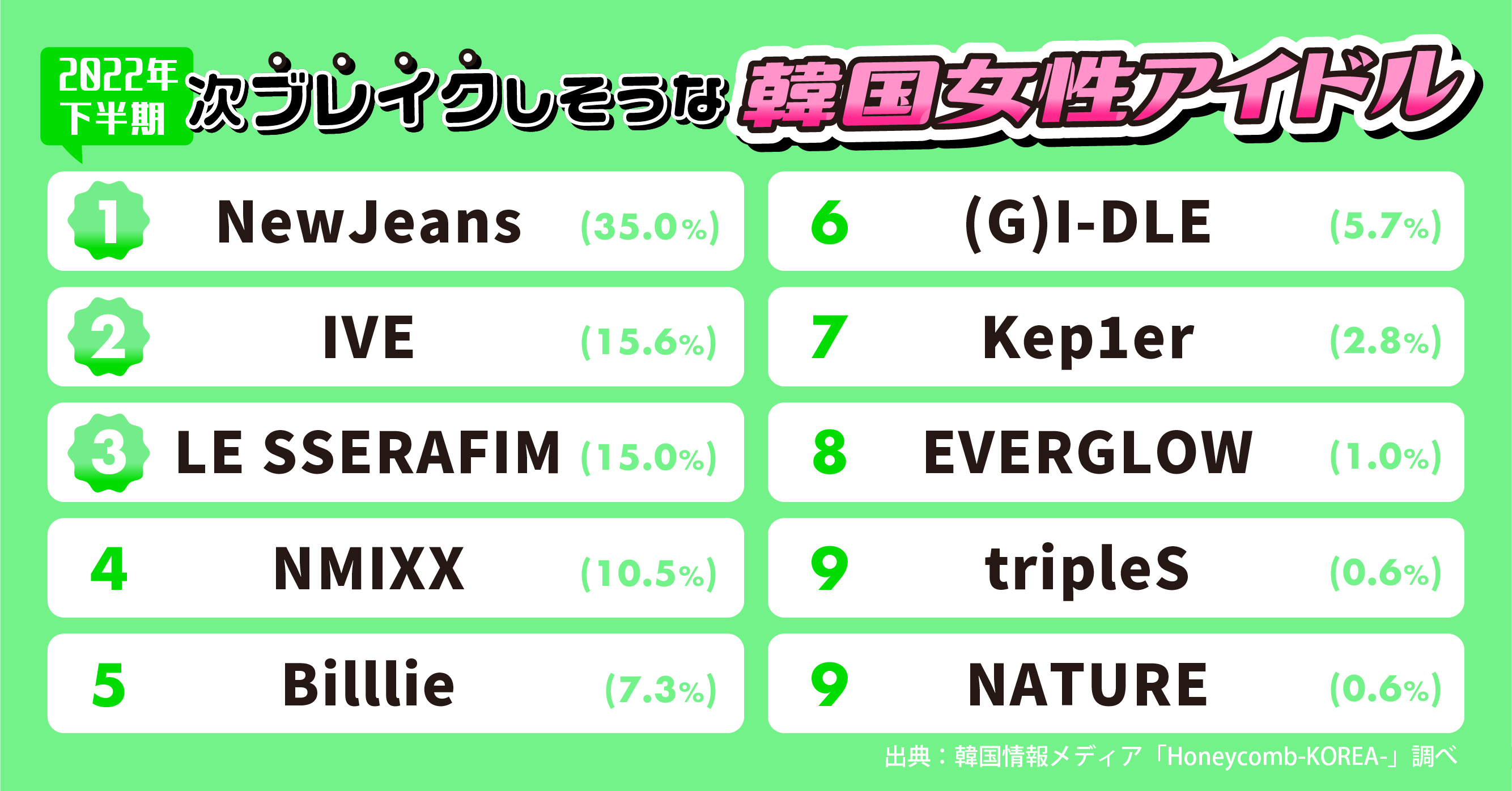 2022年下半期にハマった韓国女性アイドル第3位としても選ばれた「NewJeans」が、これからブレイクしそうなアイドルとして支持されました。デビューから数か月も経たないうちに数々の記録を打ち立て、短期間で大ブレイク。他にはない魅力的なコンセプトで多くのファンを獲得し、今後の活動に大きな期待が寄せられています。